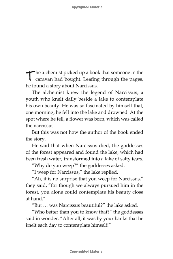 Paulo Coelho's masterpiece tells the mystical story of Santiago, an Andalusian shepherd boy who yearns to travel in search of a worldly treasure. His quest will lead him to riches far different—and far more satisfying—than he ever imagined. Santiago's journey teaches us about the essential wisdom of listening to our hearts, of recognizing opportunity and learning to read the omens strewn along life's path, and, most importantly, to follow our dreams.