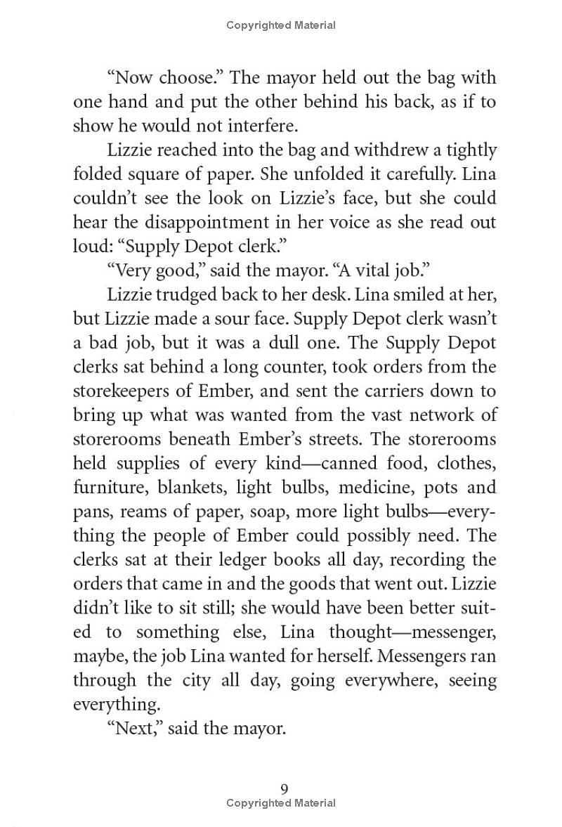 A modern-day classic. This highly acclaimed adventure series about two friends desperate to save their doomed city has captivated kids and teachers alike for almost fifteen years and has sold over 3.5 MILLION copies! The city of Ember was built as a last refuge for the human race. Two hundred years later, the great lamps that light the city are beginning to flicker. When Lina finds part of an ancient message, she's sure it holds a secret that will save the city. She and her friend Doon must race to figure out the clues before the lights go out on Ember forever! Nominated to 28 State Award Lists! An American Library Association Notable Children's Book A New York Public Library 100 Titles for Reading and Sharing Selection A Kirkus Reviews Editors' Choice A Child Magazine Best Children's Book A Mark Twain Award Winner A William Allen White Children's Book Award Winner "A realistic post-apocalyptic world. DuPrau's book leaves Doon and Lina on the verge of undiscovered country and readers wanting more." --USA Today "An electric debut." --Publishers Weekly, Starred "While Ember is colorless and dark, the book itself is rich with description." --VOYA, Starred "A harrowing journey into the unknown, and cryptic messages for readers to decipher." --Kirkus Reviews, Starred