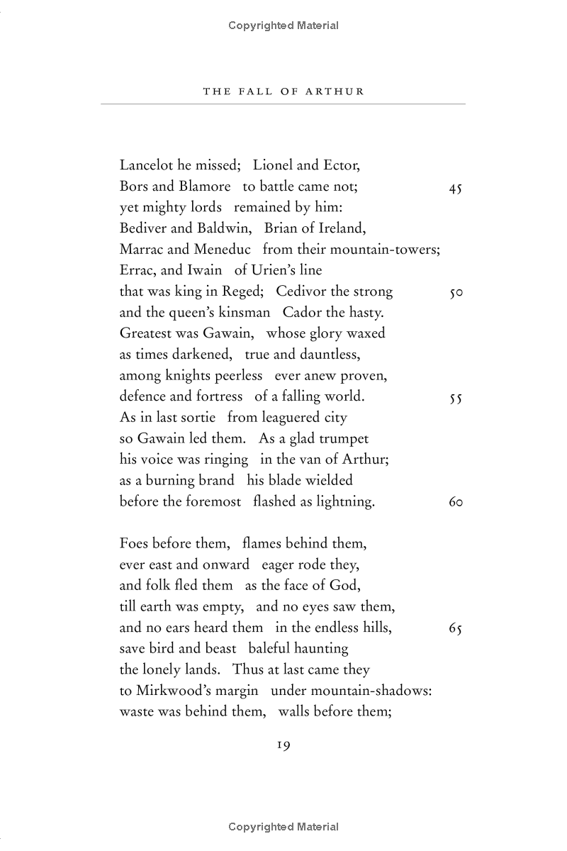 The Fall of Arthur, the only venture by J.R.R. Tolkien into the legends of Arthur King of Britain, may well be regarded as his finest and most skilful achievement in the use of the Old English alliterative metre, in which he brought to his transforming perceptions of the old narratives a pervasive sense of the grave and fateful nature of all that is told: of Arthur's expedition overseas into distant heathen lands, of Guinevere's flight from Camelot, of the great sea-battle on Arthur's return to Britain, in the portrait of the traitor Mordred, in the tormented doubts of Lancelot in his French castle.