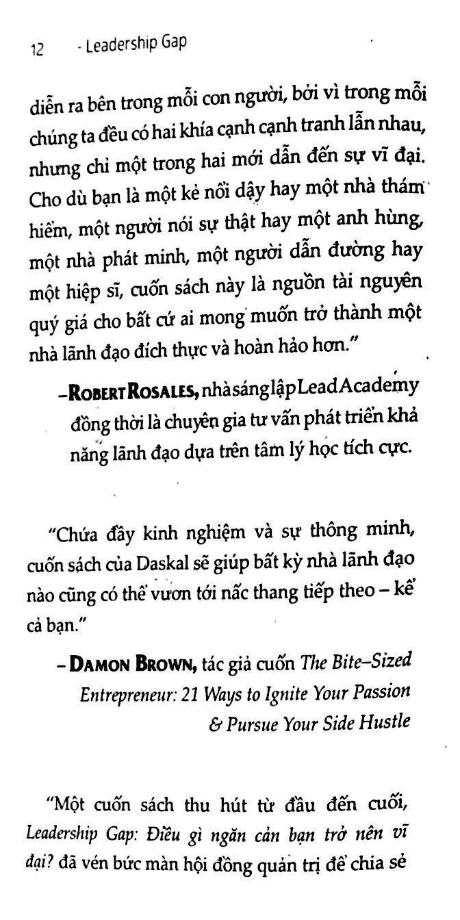 Theo Daskal, nhiều khi những tố chất lãnh đạo bạn cho là nổi trội nhất của mình lại là thứ cản trở bạn vươn tới những điều lớn lao; trong khi những gì bạn coi là lỗ hổng, là khuyết điểm lại có thể trở thành nền tảng cho sự vĩ đại - miễn rằng bạn biết cách lấp đầy chúng, biến chúng thành ưu thế của mình.