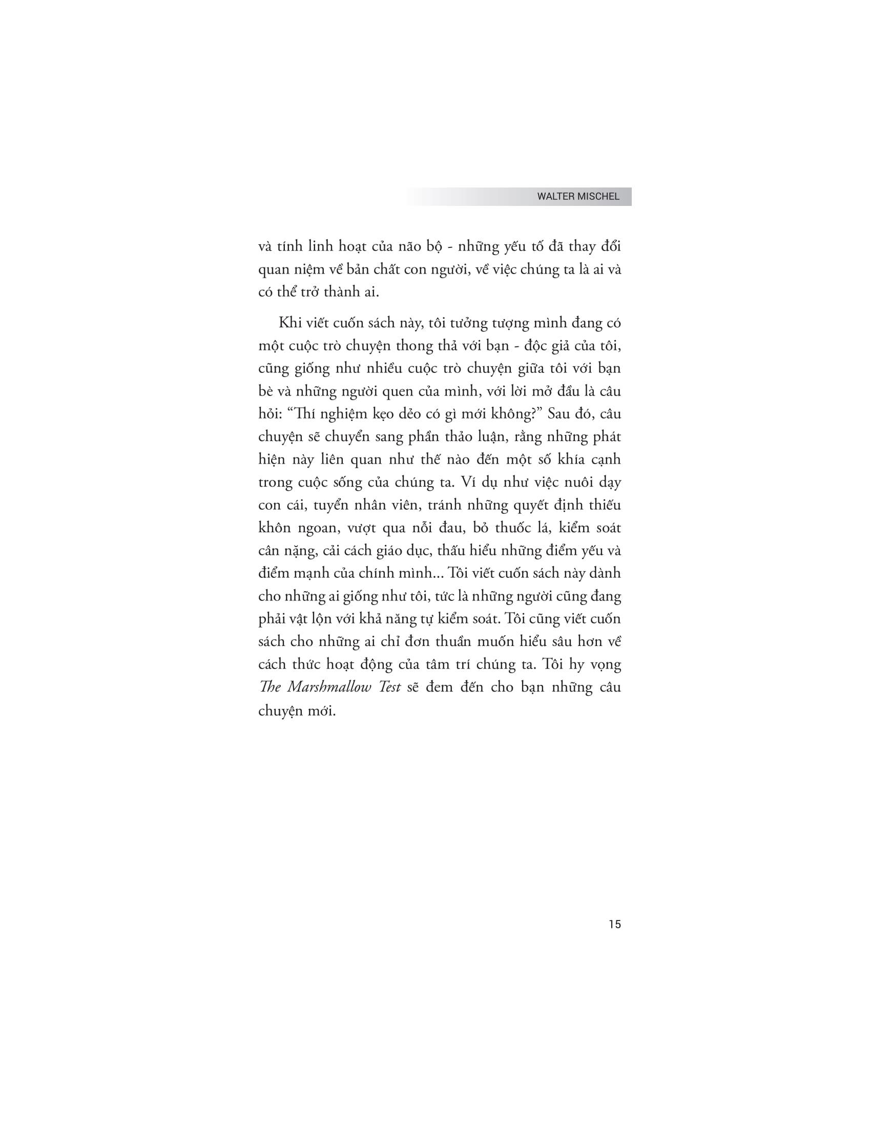 Cuốn sách The Marshmallow Test của Walter Mischel là một tác phẩm nổi tiếng trong lĩnh vực tâm lý học, tập trung vào việc khám phá và nâng cao khả năng tự kiểm soát, một yếu tố quan trọng giúp cá nhân đạt được thành công và hạnh phúc trong cuộc sống. Dựa trên thí nghiệm kinh điển "Bài kiểm tra kẹo dẻo" (Marshmallow Test), cuốn sách không chỉ phân tích mối liên hệ giữa khả năng kiềm chế bản thân từ khi còn nhỏ và thành công trong cuộc sống sau này mà còn đưa ra những hướng dẫn thiết thực về cách cải thiện kỹ năng tự chủ này.