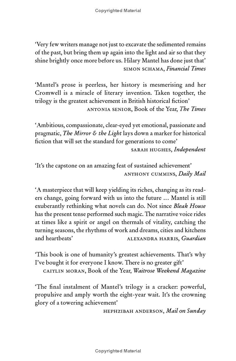 The Mirror & The Light The Sunday Times bestselling sequel to Wolf Hall and Bring Up the Bodies, the stunning conclusion to Hilary Mantel’s Man Booker Prize-winning Wolf Hall trilogy. A Guardian Book of the