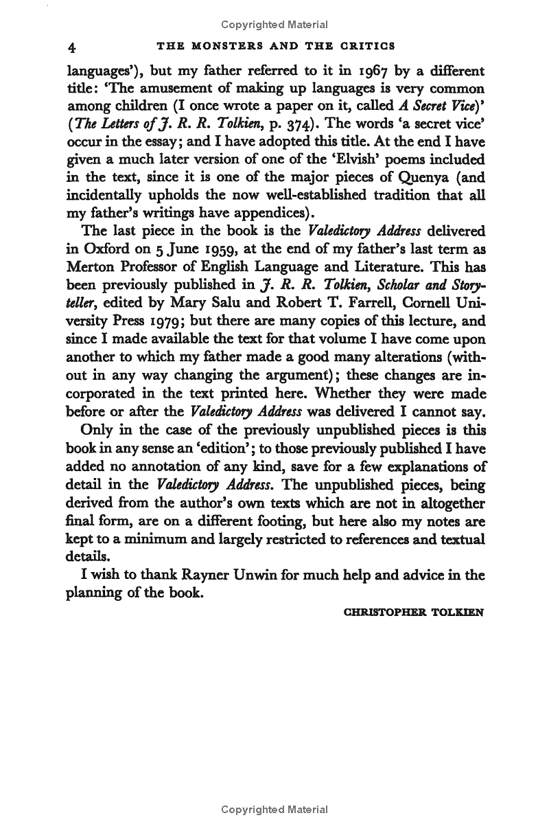 Also included in this volume is the lecture English and Welsh; the Valedictory Address to the University of Oxford in 1959; and a paper on Invented Languages red in 1931, with exemplification from poems in the Elvish tongues. Most famous of all is On Fairy-Stories, a discussion of the nature of fairy-tales and fantasy, which gives insight into Tolkien's approach to the whole genre.