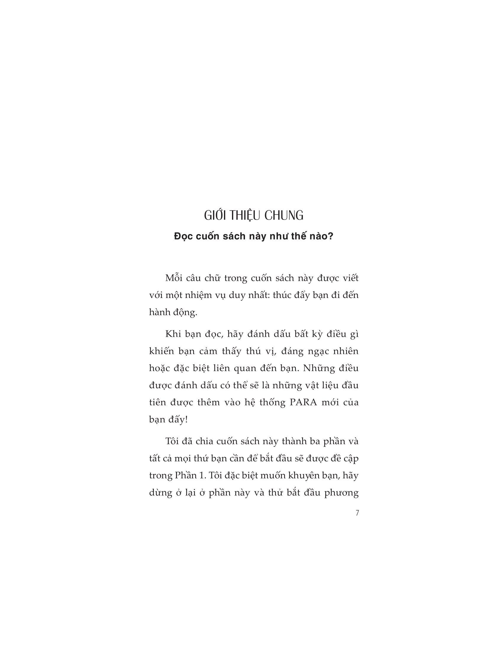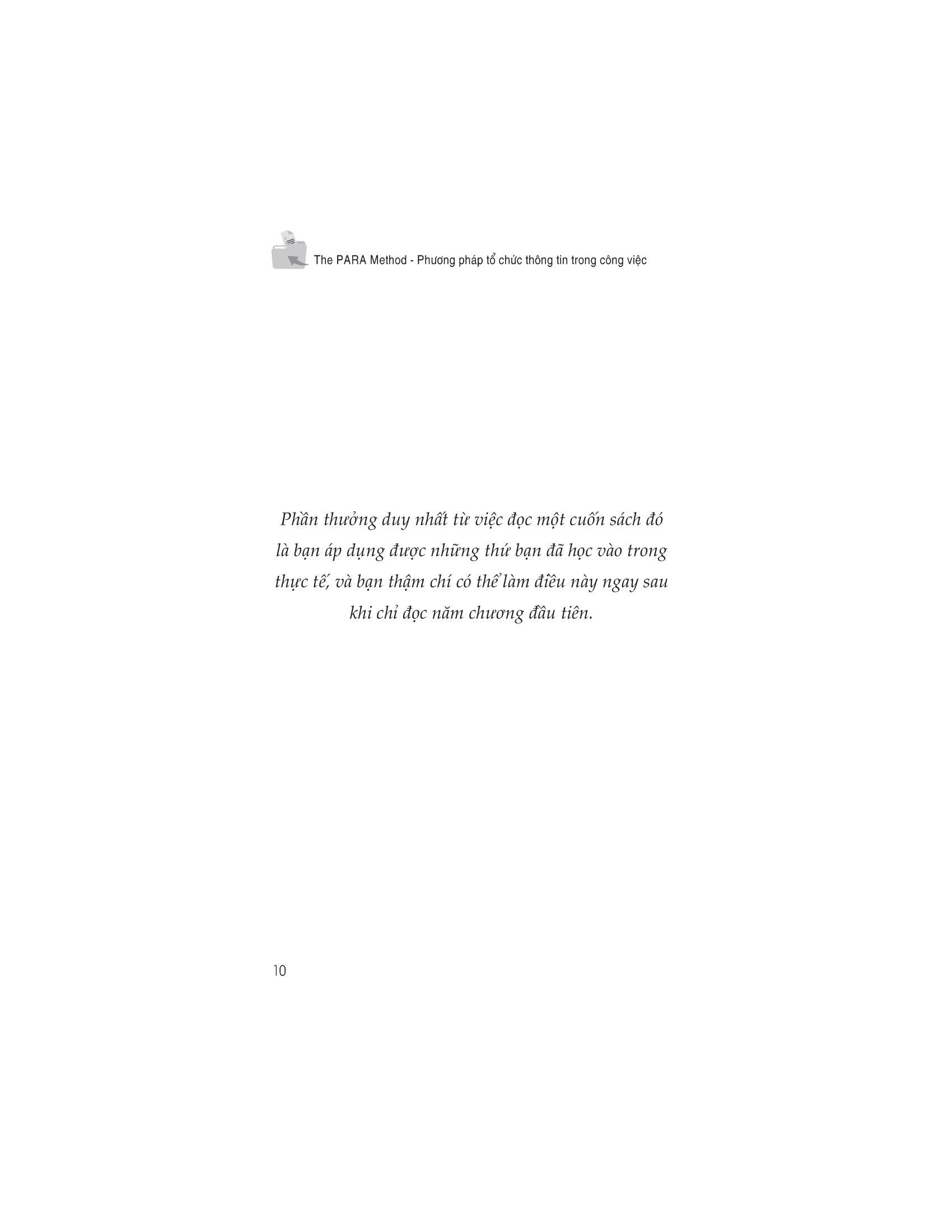 Cuộc sống hiện đại đòi hỏi phải xử lý rất nhiều thông tin. Nhưng chúng ta chưa bao giờ được dạy cách quản lý thông tin một cách hiệu quả để có thể tìm thấy thứ m.ình cần. Trong The PARA METHOD – Phương pháp tổ chức thông tin trong công việc, Tiago Forte phác thảo một hệ thống bốn bước đơn giản và trực quan sẽ giúp chúng ta sắp xếp tất cả thông tin tràn ngập trong não thành bốn loại chính. Theo đó PARA là từ viết tắt của “Projects” (Dự án), “Areas” (Lĩnh vực), “Resources” (Tài nguyên) và “Archives” (Lưu trữ).