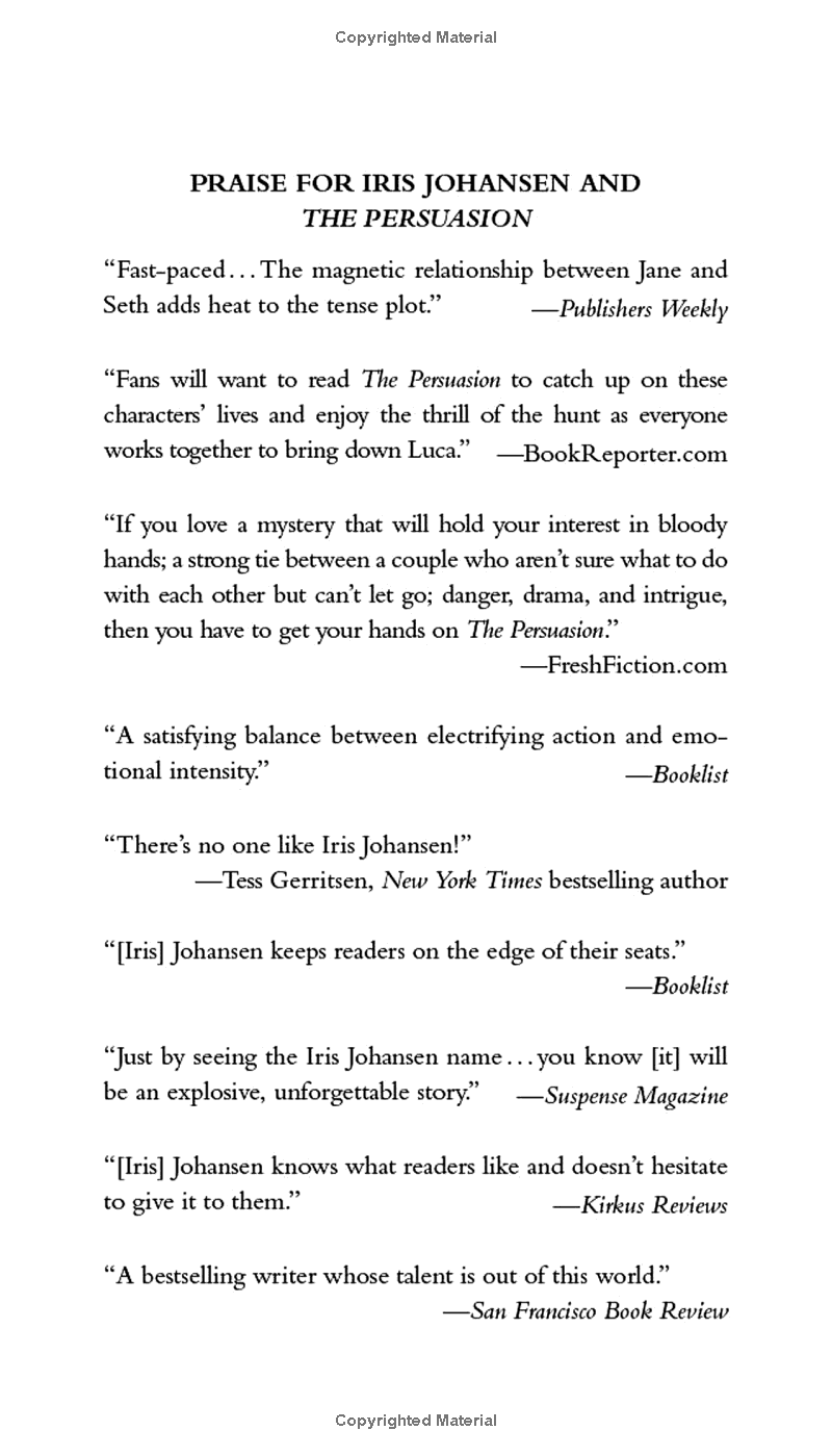 The Persuasion When she becomes a madman's target, Eve Duncan's daughter Jane must team up with longtime love interest Seth Caleb in this suspense novel from the #1 bestselling author of Smokescreen. Forensic sculptor Eve Duncan