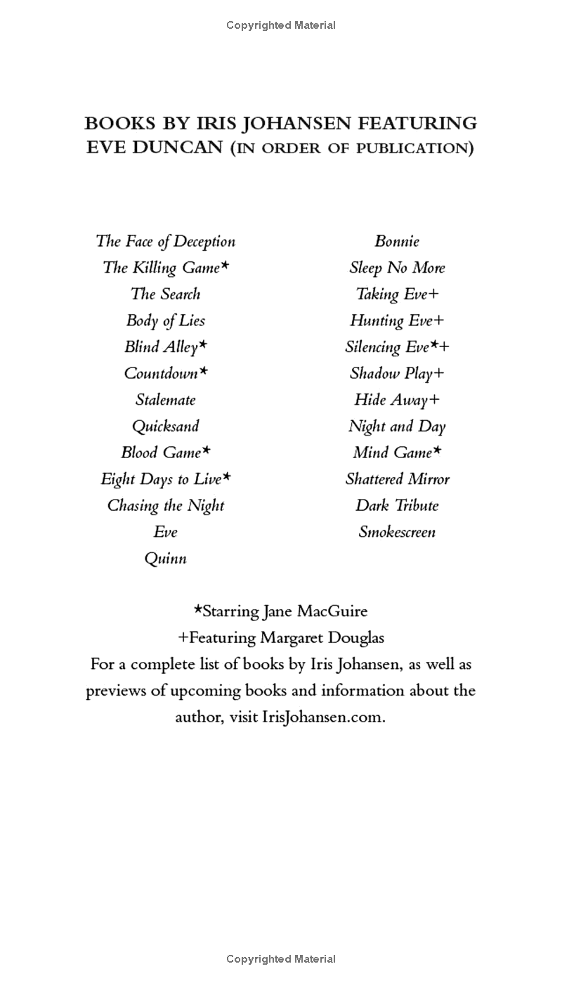 When she becomes a madman's target, Eve Duncan's daughter Jane must team up with longtime love interest Seth Caleb in this suspense novel from the #1 bestselling author of Smokescreen.