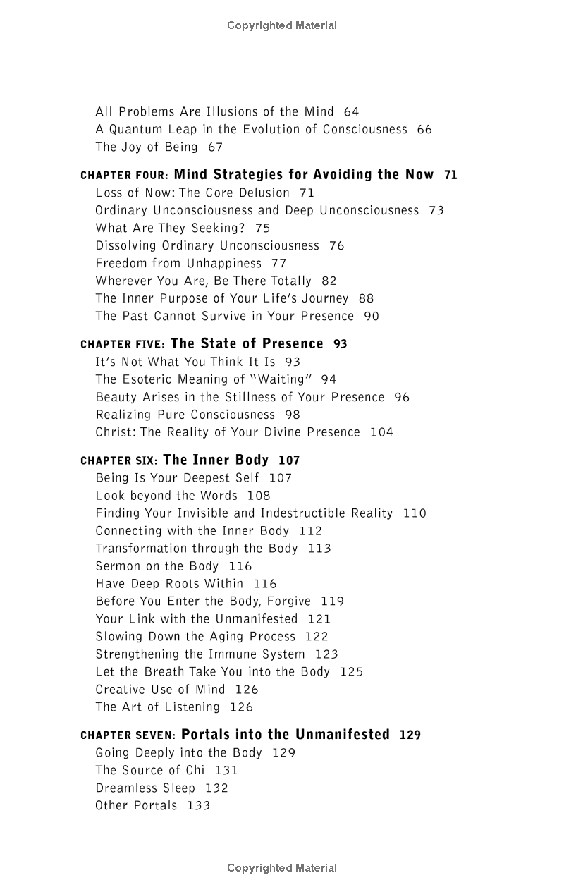 In the first chapter, Tolle introduces readers to enlightenment and its natural enemy, the mind. He awakens readers to their role as a creator of pain and shows them how to have a pain-free identity by living fully in the present. The journey is thrilling, and along the way, the author shows how to connect to the indestructible essence of our Being, "the eternal, ever-present One Life beyond the myriad forms of life that are subject to birth and death."