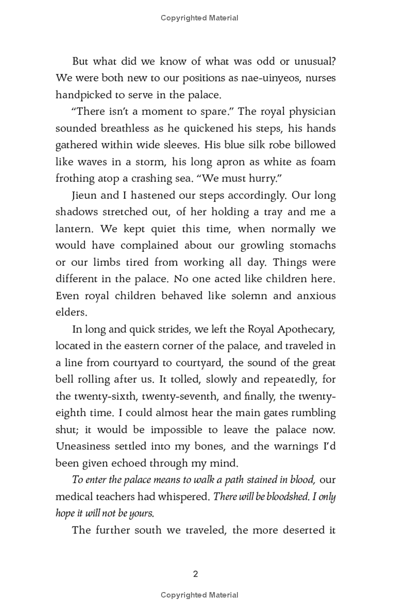 Joseon (Korea), 1758. There are few options available to illegitimate daughters in the capital city, but through hard work and study, eighteen-year-old Hyeon has earned a position as a palace nurse. All she wants is to keep her head down, do a good job, and perhaps finally win her estranged father's approval.