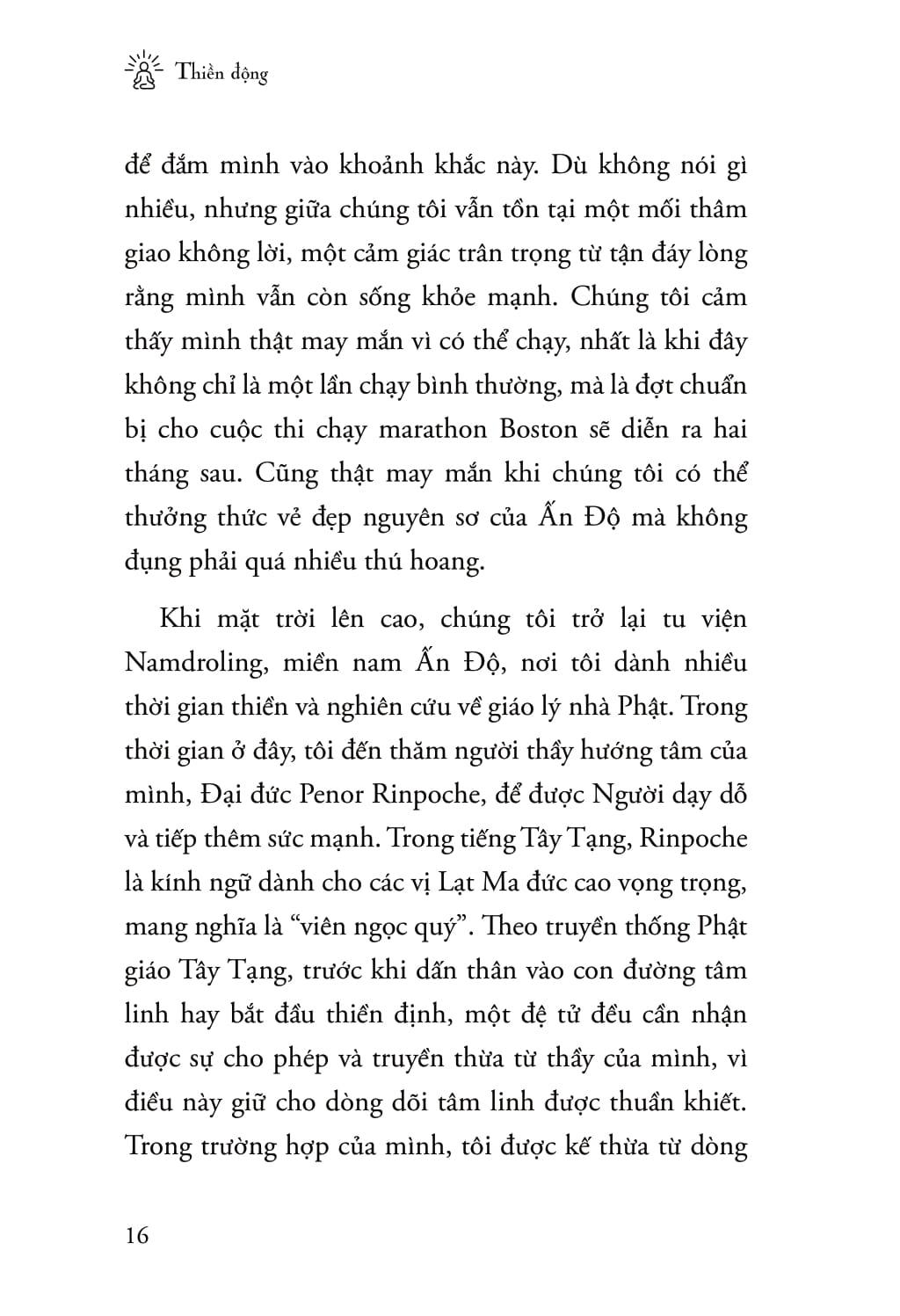 Tác giả không chỉ đưa ra những nguyên tắc thiền cơ bản mà ông đã đúc kết từ nhiều năm tu tập, mà còn chỉ rõ rằng bất cứ ai – không phân biệt độ tuổi, thể trạng hay trình độ – đều có thể thực hành việc kết hợp giữa thiền và chạy bộ. Thông qua những hướng dẫn cụ thể và lời khuyên sâu sắc, ông giúp người đọc hiểu cách tạo ra sự hòa hợp giữa cơ thể và tâm trí, từ đó đạt được sự bình an và cân bằng trong cuộc sống.