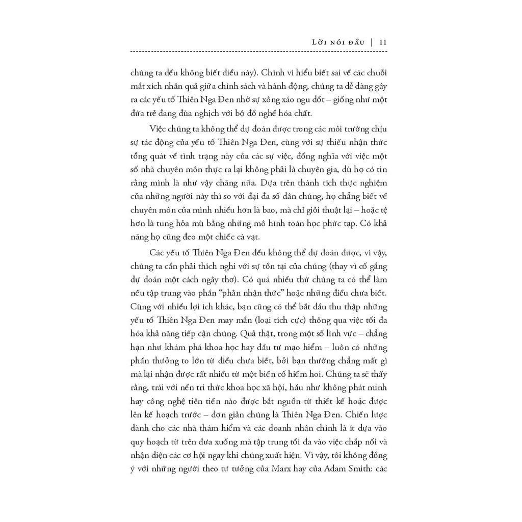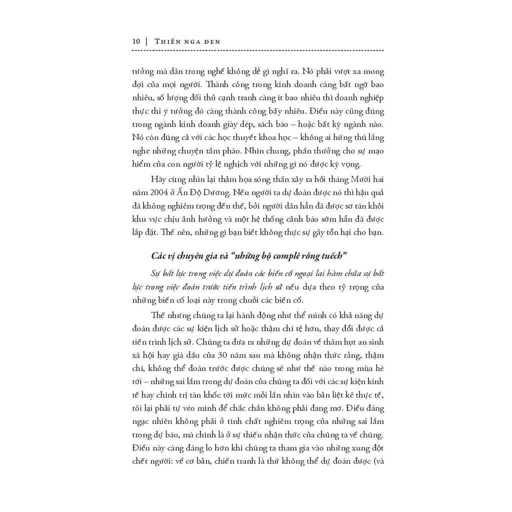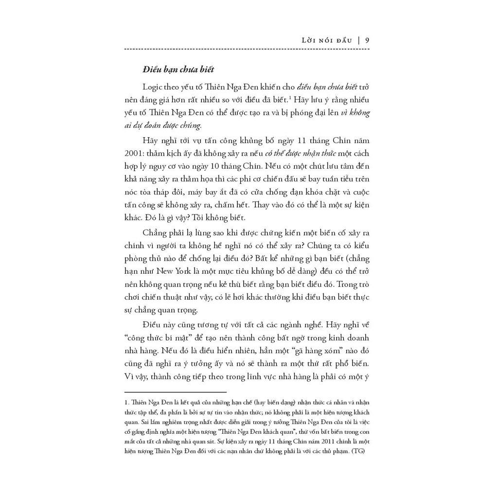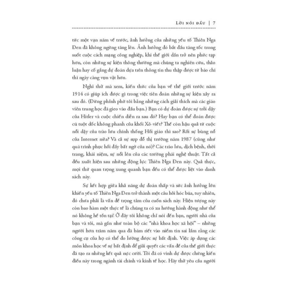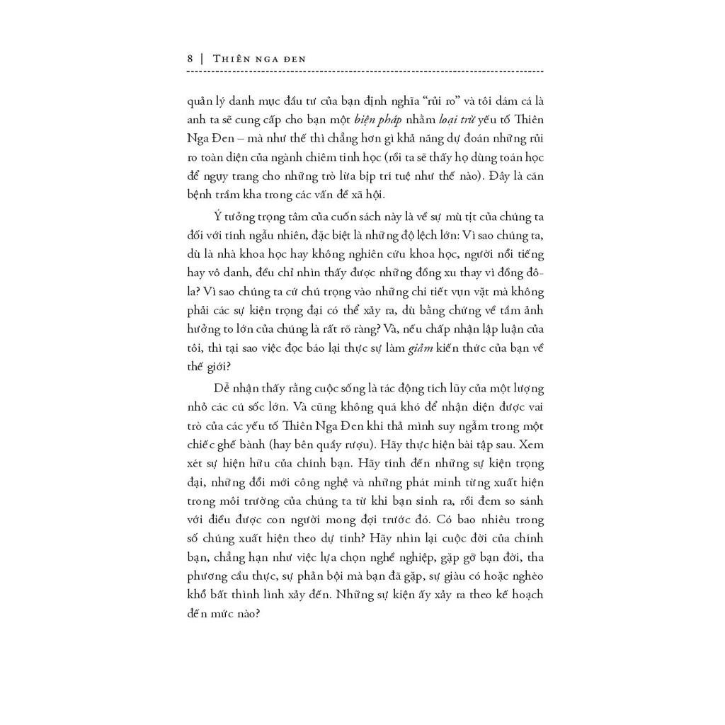 Mua tại TiktokTrước khi khám phá ra thiên nga đen tồn tại trên đời (ở Úc), người ta vẫn tin rằng tất cả chim thiên nga trên đời đều có màu trắng. Phát hiện bất ngờ này đã thay đổi toàn bộ thế giới quan của nhân loại (về thiên nga). Chúng ta không biết rất nhiều thứ nhưng lại hành động như thể mình có khả năng dự đoán được mọi điều. Và trong cuốn sách này, tác giả Nassim Nicholas Taleb đã đi sâu vào khai thác những sai lầm của tư tưởng cố hữu ấy. Theo ông, “thiên nga đen” là một biến cố tưởng chừng như không thể xảy ra với ba đặc điểm chính: không thể dự đoán, có tác động nặng nề và sau khi nó xảy ra, người ta lại dựng lên một lời giải thích để khiến nó trở nên ít ngẫu nhiên hơn, dễ dự đoán hơn so với bản chất thật của nó. Thành công đáng kinh ngạc của Fb có thể được coi là một “thiên nga đen”, việc nước Anh rời khỏi Liên minh châu Âu cũng là một “thiên nga đen”. Thiên nga đen luôn ẩn hiện trong mọi mặt của cuộc sống với những tác động khó lường, theo cả hướng tiêu cực và tích cực. Tinh tế, táo bạo nhưng không kém phần thú vị, Thiên Nga Đen chắc chắn là cuốn sách không thể bỏ qua cho những ai đam mê hiểu biết. Và cuốn sách này, bản thân nó cũng chính là một thiên nga đen…