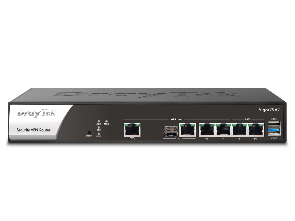 Thiết bị mạng DrayTek Vigor2962 Enterprise high performance dual-gigabit WAN Firewall VPN router – 2 Gigabit WAN port (1 x 2.5GbE & 1 x SFP/GbE combo & 2 x GbE) – 4 Gigabit LAN port
