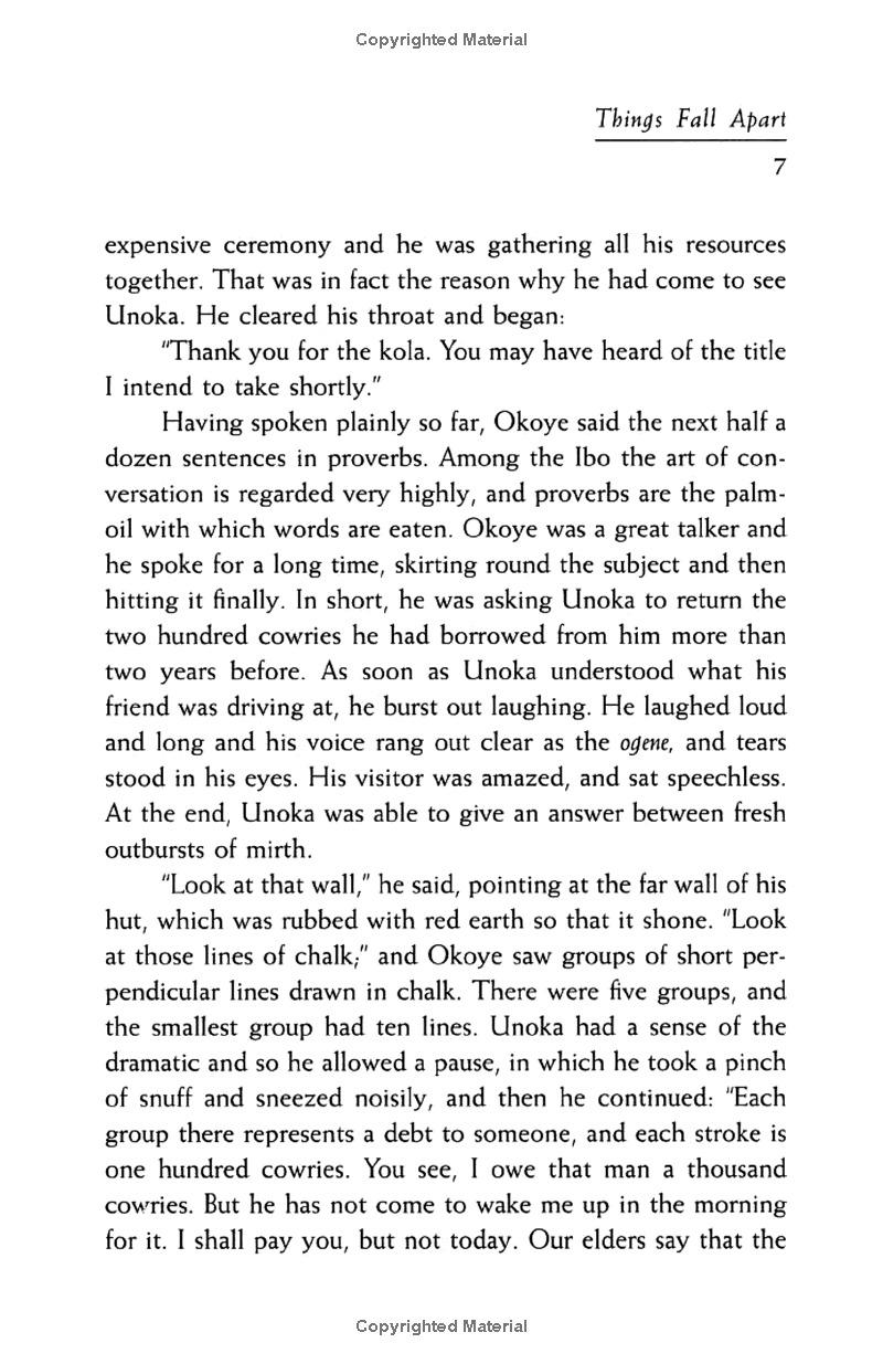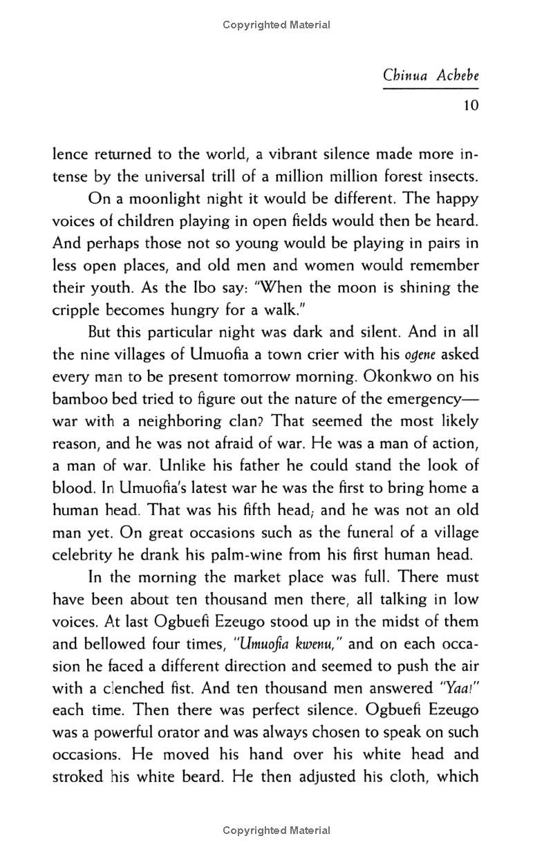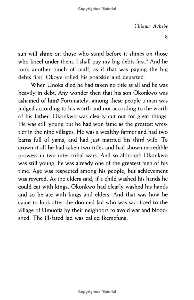 With more than 20 million copies sold and translated into fifty-seven languages, Things Fall Apart provides one of the most illuminating and permanent monuments to African experience. Achebe does not only capture life in a pre-colonial African village, he conveys the tragedy of the loss of that world while broadening our understanding of our contemporary realities.