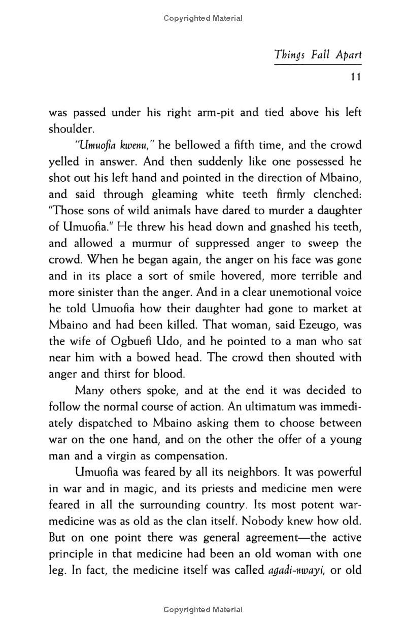 Things Fall Apart is the first of three novels in Chinua Achebe's critically acclaimed African Trilogy. It is a classic narrative about Africa's cataclysmic encounter with Europe as it establishes a colonial presence on the continent. Told through the fictional experiences of Okonkwo, a wealthy and fearless Igbo warrior of Umuofia in the late 1800s, Things Fall Apart explores one man's futile resistance to the devaluing of his Igbo traditions by British political andreligious forces and his despair as his community capitulates to the powerful new .