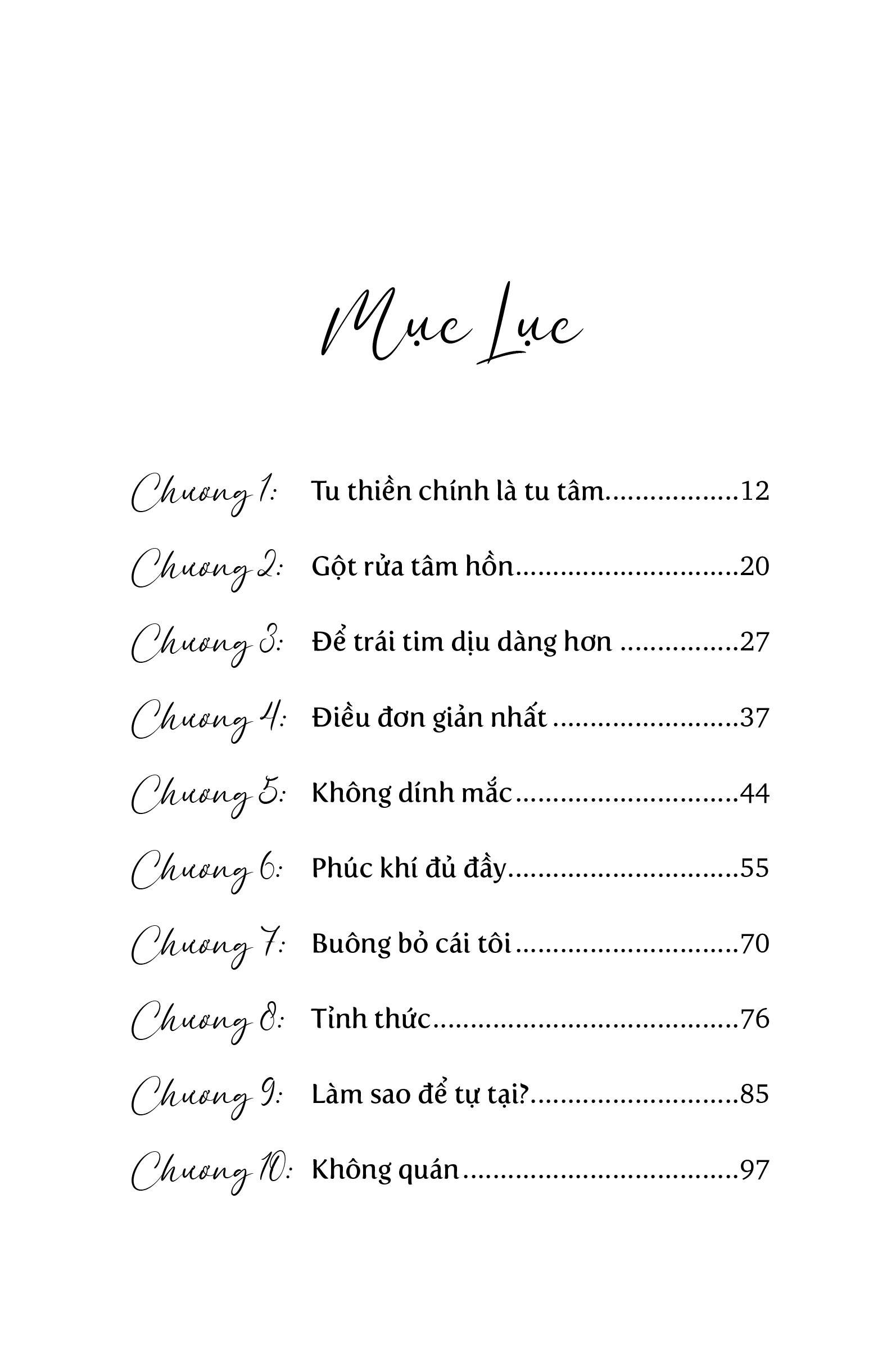 Tác phẩm gồm 20 chương, đề cập đến nhiều khía cạnh quan trọng trong quá trình tu tập và chuyển hóa tâm hồn, từ thiền định, buông bỏ, chấp nhận bản ngã đến việc tìm thấy niềm vui trong sự đơn giản. Hiền Tông không chỉ phân tích sâu sắc về triết lý Phật giáo mà còn lồng ghép những câu chuyện đời thường, giúp độc giả dễ dàng ứng dụng các bài học vào cuộc sống thực tế.