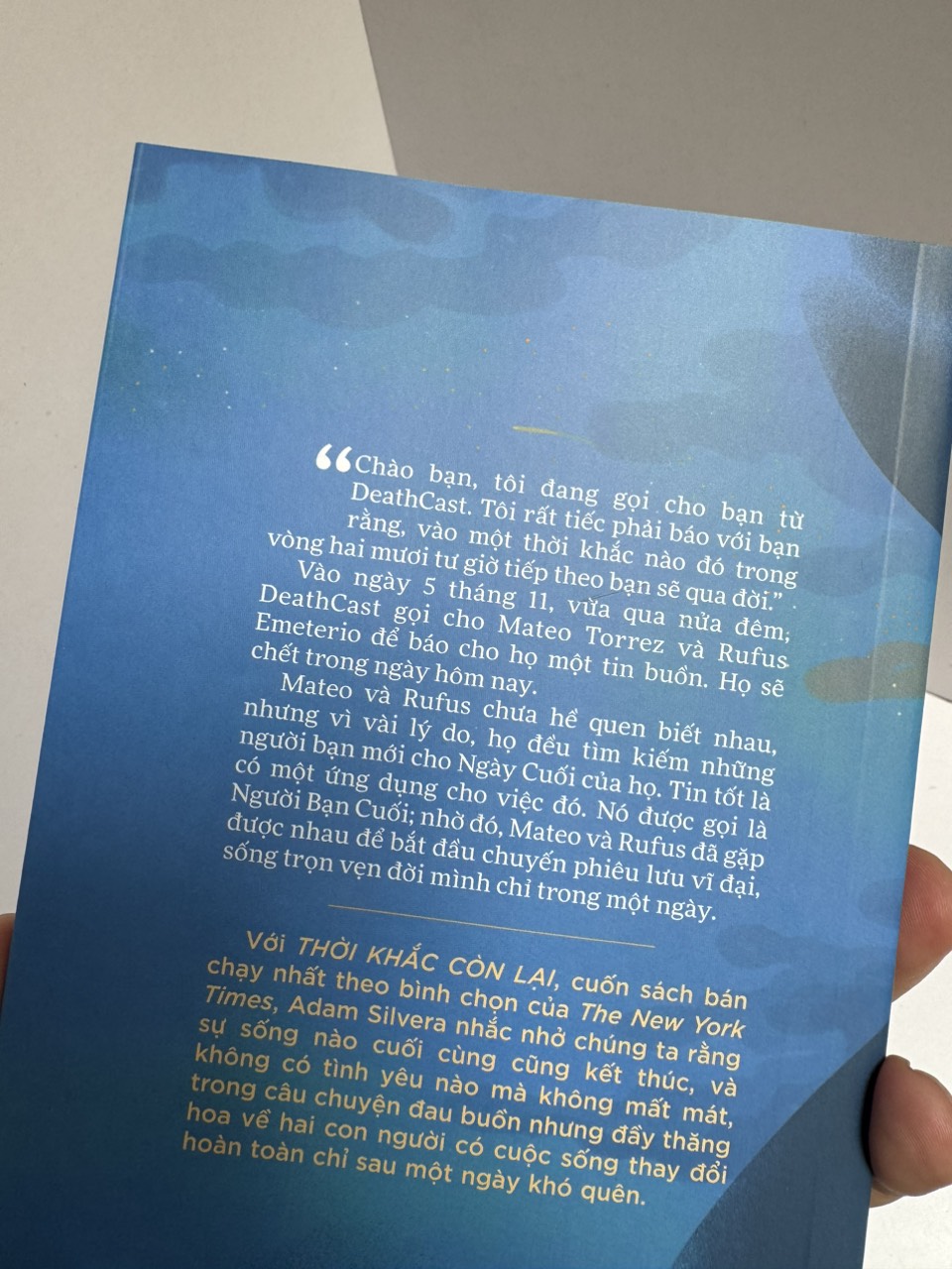 Viết về một bi kịch sẽ xảy ra trong thời gian ngắn ngủi với vô số cuộc phiêu lưu, nhưng giọng văn của tác giả lại không hề gấp gáp mà lại rất dịu dàng và chậm rãi. Qua từng thời khắc một của kim đồng hồ, mỗi giây phút trôi qua là cuộc sống của Meteo và Rufus dần cạn, nhưng hai cậu trai cũng ngày một trưởng thành, chấp nhận bước ra khỏi ranh giới an toàn và trở thành kiểu người mà mình luôn mong ước - hòa giải với quá khứ đau thương, và sống trọn vẹn từng phút giây.
