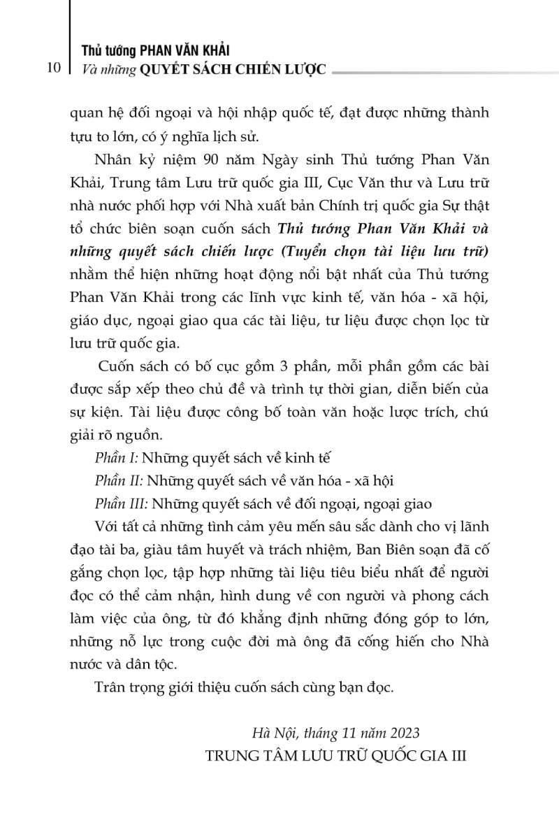 Nhân kỷ niệm 90 năm Ngày sinh Thủ tướng Phan Văn Khải, Trung tâm Lưu trữ quốc gia III, chúng tôi biên soạn cuốn sách Thủ tướng Phan Văn Khải và những quyết sách chiến lược (Tuyển chọn tài liệu lưu trữ) nhằm thể hiện những hoạt động nổi bật nhất của Thủ tướng Phan Văn Khải trong các lĩnh vực kinh tế, văn hóa – xã hội, giáo dục, ngoại giao qua các tài liệu, tư liệu được chọn lọc từ lưu trữ quốc gia.