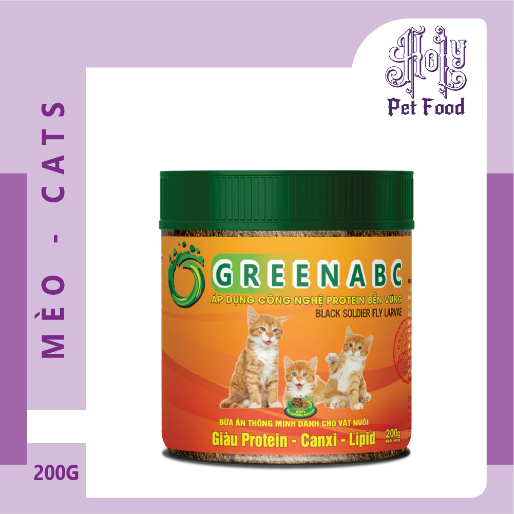 GREENABC là thức ăn cao cấp dành cho các mèo. Đặc biệt sản phẩm GREENABC được sản xuất theo phương pháp Áp dụng công nghệ PROTEIN BỀN VỮNG từ bột đạm G.Meal rất giàu PROTEIN–CANXI–LIPID có trong BSFL*, đã được Mỹ (AAFCO) và EU chấp nhận đưa vào công thức cho ngành sản xuất thức ăn dành cho thú cưng.