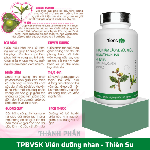 Công dụng: Viên dưỡng nhan Tiens được chắt lọc tinh túy từ 8 loại thảo dược quí thiên nhiên như Xuyên khung, Bạch thược, Ích mẫu, Đương quy, Thục đia, Labisiapumila, Manjakani và Nhân sâm