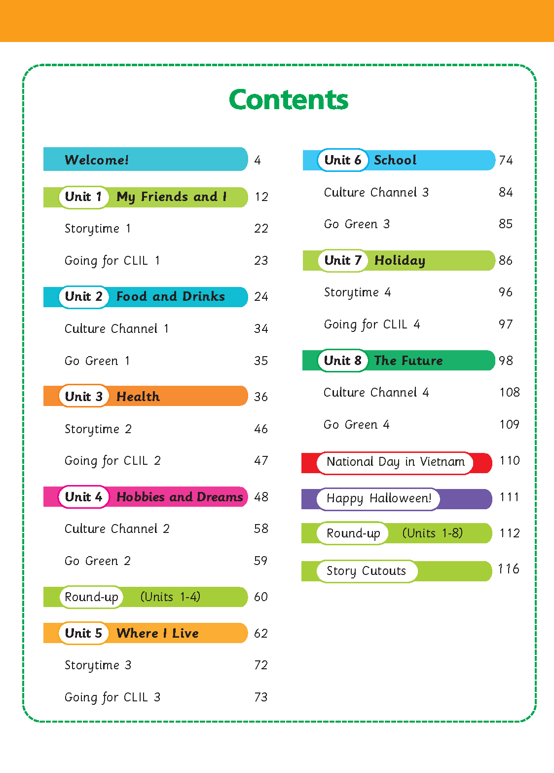 Sách: Learning English 4 - Dành Cho Học Sinh Lớp 4 NỘI DUNG VÀ CẤU TRÚC CỦA QUYỂN SÁCH : Bảng mục lục: Chỉ rõ các mục tiêu chính và trọng tâm của mỗi bài
