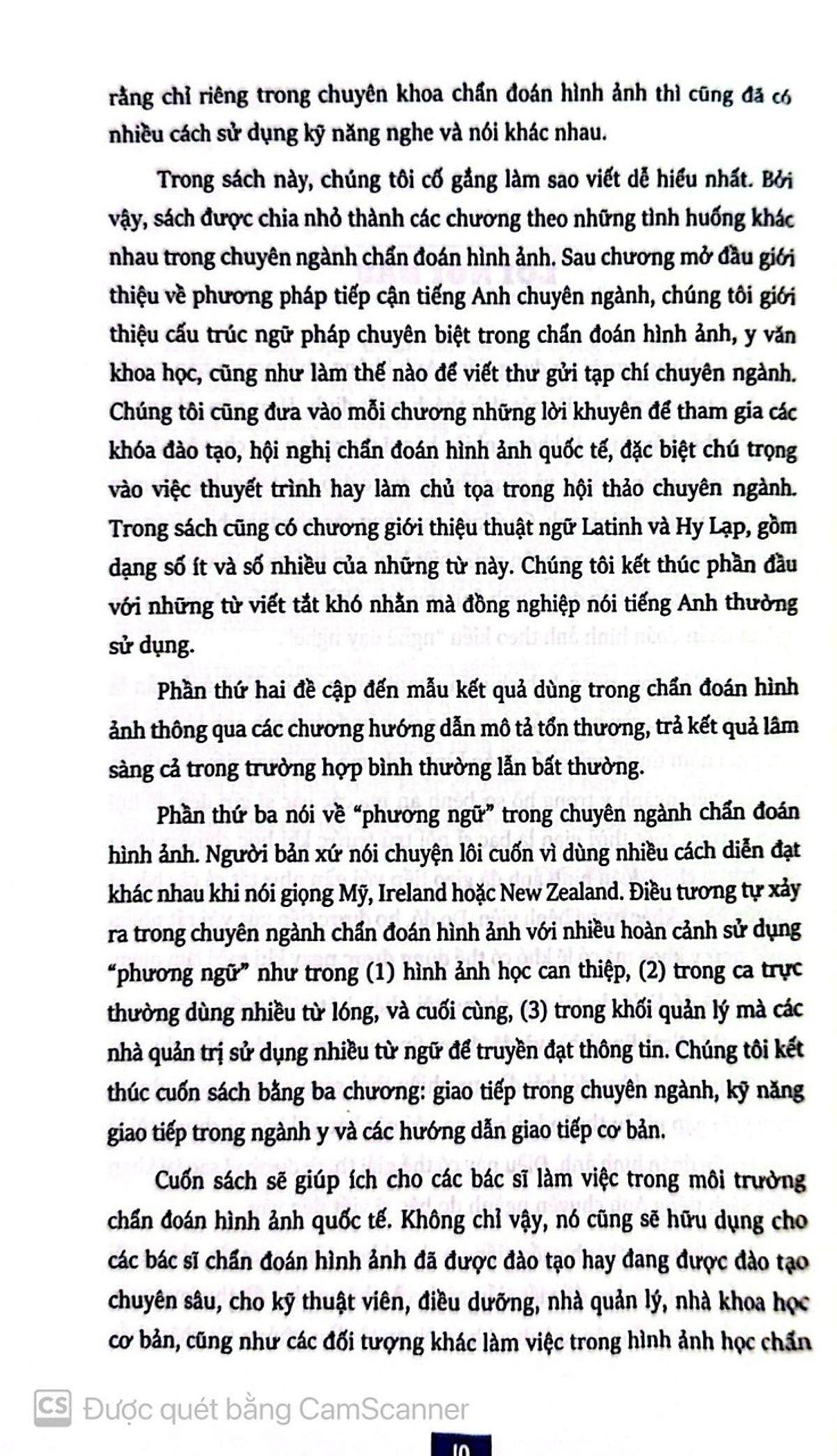 Đặc biệt, phần thứ ba nói về “phương ngữ” trong chuyên ngành chẩn đoán hình ảnh. Các bác sĩ nói tiếng Anh đến từ Mỹ, Ireland hoặc New Zealand. Vì vậy, bạn đọc sẽ được tìm hiểu “phương ngữ” chuyên ngành trong nhiều hoàn cảnh như (1) hình ảnh học can thiệp, (2) ca trực thường dùng nhiều từ lóng, và cuối cùng, (3) trong khối quản lý mà các nhà quản trị sử dụng nhiều từ ngữ để truyền đạt thông tin.