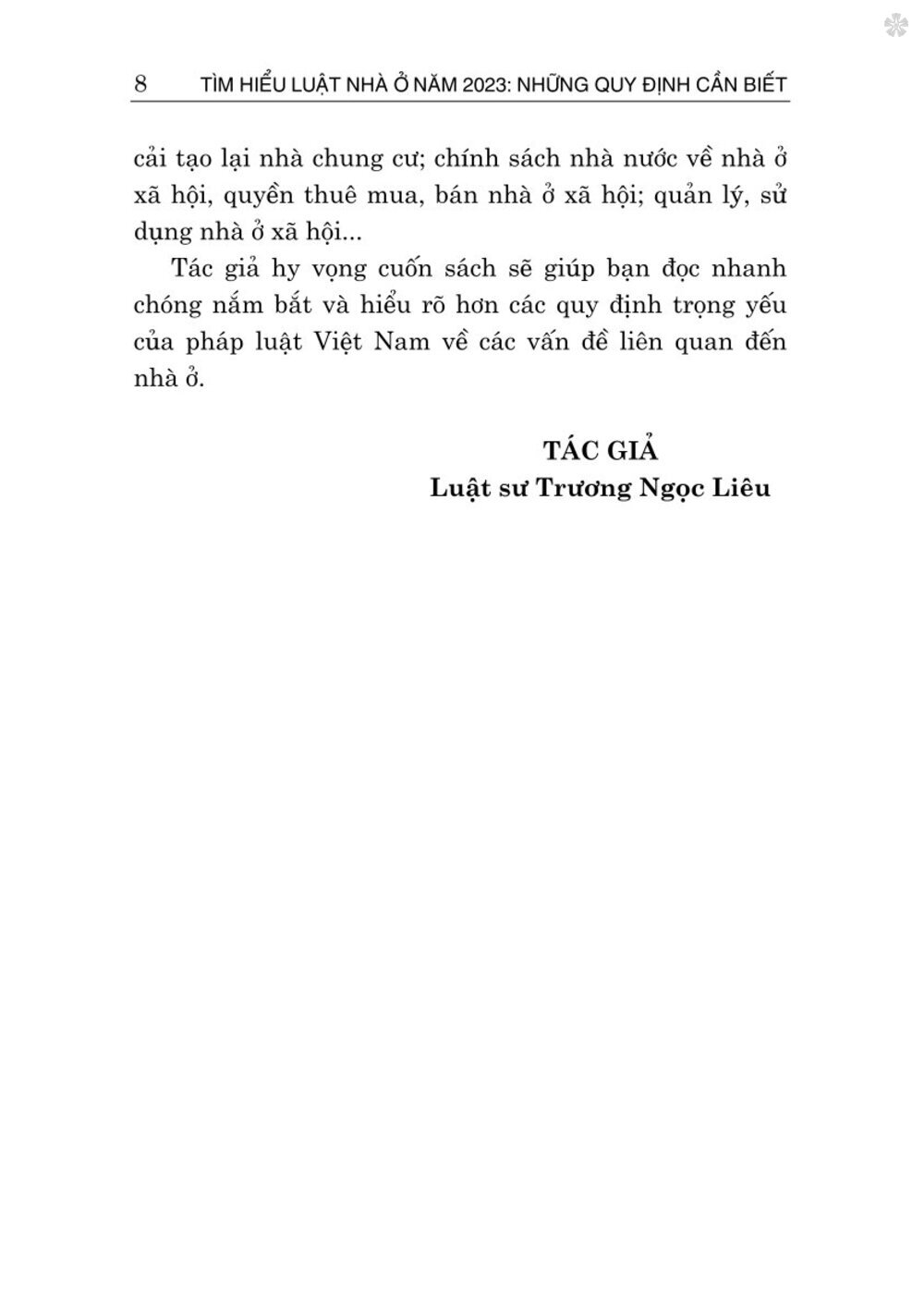 Mua tại TiktokNhằm kịp thời phục vụ nhu cầu của bạn đọc, Nhà xuất bản Chính trị quốc gia Sự thật xuất bản cuốn sách Tìm hiểu Luật Nhà ở năm 2023: Những quy định cần biết do Luật sư Trương Ngọc Liêu biên soạn. Cuốn sách gồm 07 chương: Chương I: Những nội dung cơ bản. Chương II: Quyền sở hữu nhà ở tại Việt Nam của tổ chức, cá nhân nước ngoài. Chương III: Phát triển nhà ở. Chương IV: Chính sách về nhà ở xã hội. Chương V: Cải tạo, xây dựng lại nhà chung cư. Chương VI: Quản lý, sử dụng nhà chung cư. Chương VII: Giao dịch về nhà ở. Xin trân trọng giới thiệu cuốn sách và mong nhận được ý kiến góp ý của bạn đọc.