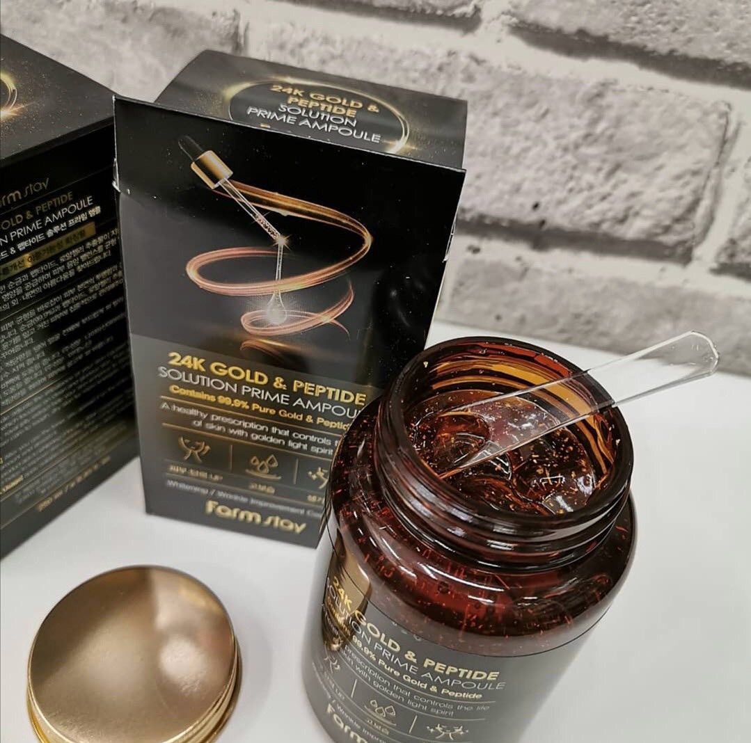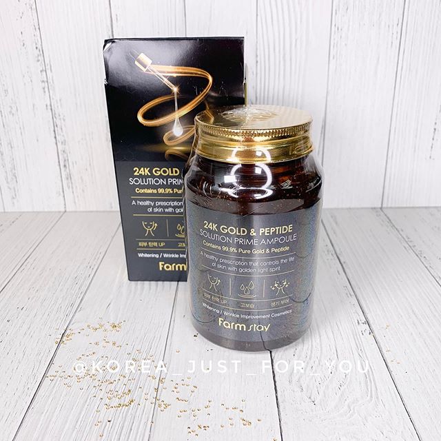 FarmStay 24k Gold & Peptide Perfect Ampoule chứa hàm lượng cao Peptide tinh khiết 3000 ppm và các dưỡng chất trong một sản phẩm. Ampoule này thẩm thấu rất nhanh vào da giúp dưỡng trắng da, chống nhăn, căng bóng da rất hiệu quả đồng thời hỗ trợ chống viêm, mau liền vết thương trong trường hợp da bị mụn, hoặc mới điều trị bằng các phương pháp laser, lăn à Ampoule này còn giúp tăng cường sức đề kháng cho da, bảo vệ da khỏi các tác hại của môi trường.