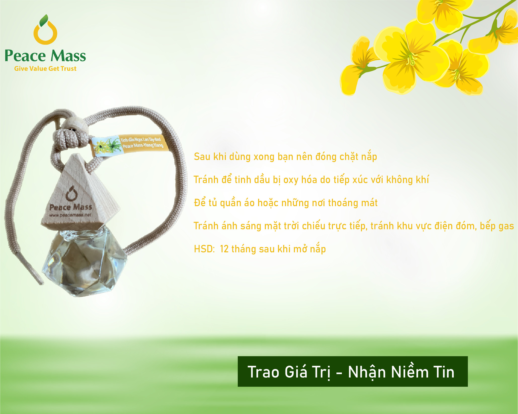 Tinh dầu Ngọc Lan Tây Peace Mass – Ylang Ylang - Nguyên liệu: nhập khẩu - Dung tích: 8ml - Vị trí sử dụng: Treo trên ô tô, trong tủ quần áo, phòng khách, phòng