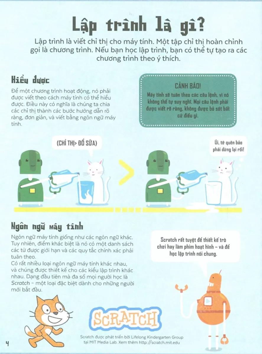 Mua tại TiktokCẩm nang hướng dẫn hoàn chỉnh và đơn giản nhất dành cho bạn trẻ bắt đầu học lập trình Ngôn ngữ lập trình Scratch đặc biệt phù hợp cho bạn trẻ mới học, vì tính tương tác trực quan, đồ họa sống động, ra sản phẩm liền tay mà vẫn đảm bảo khoa học và liên thông tri thức sau này. Chỉ cần nắm và kéo các khối lệnh đầy màu sắc có sẵn để lắp ghép thành một kịch bản điều khiển các đối tượng trên màn hình. Không có những dòng lệnh logic khô cứng và dễ lỗi, những khái niệm kỹ thuật khó hiểu, những quy tắc luật lệ chằng chịt và mệt mỏi trong các ngôn ngữ lập trình kiểu người lớn.