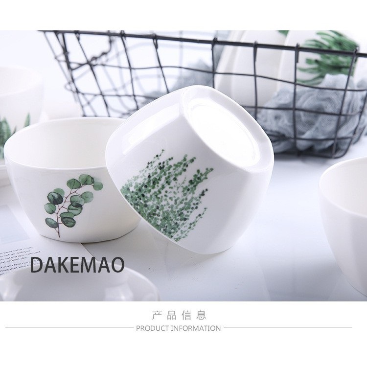 06 chén cơm D11H5.5, 06 gác đũa các loại, 02 chén chấm hình nón D9H4.5, 01 đĩa vuông 20H2, 01 tô canh tròn D17H9, 01 đĩa tròn D22H3.5 Trọng lượng 4kg, bao bì 0.4kg