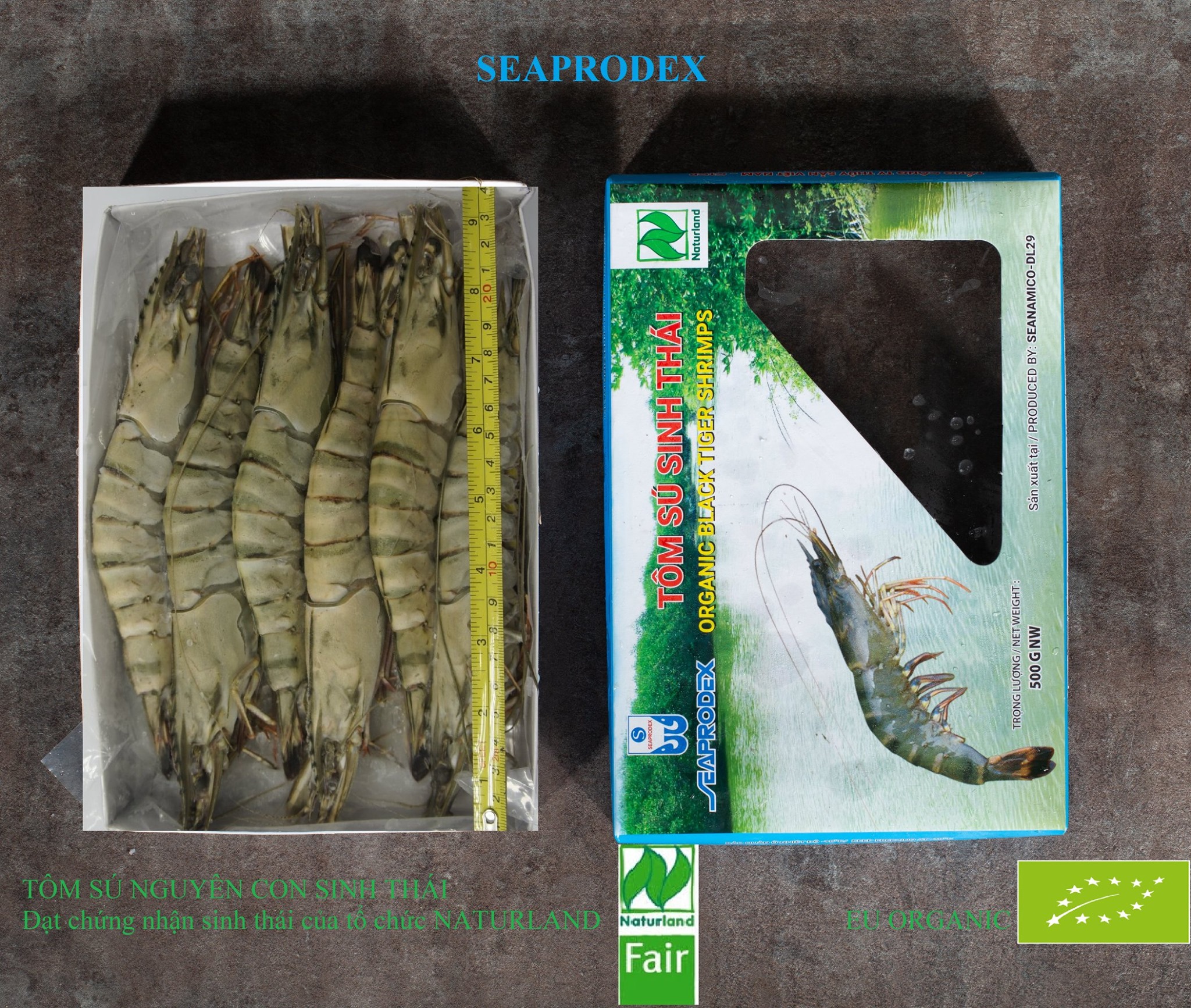 Sản phẩm Tôm sú nguyên con sinh thái Seaprodex được lấy nguyên liệu từ xã Viên An Đông, huyện Ngọc Hiển, Cà Mau. Nhà máy chế biến tọa lạc tại huyện Năm Căn. Những con tôm còn tươi sống được lựa chọn, rửa sạch, chế biến rồi cấp đông nhanh với nhiệt độ xuống tới -40 độ C, nên tôm đảm bảo hương vị tươi ngon như vừa đánh bắt lên.- Sản phẩm Tôm được chứng nhận Organic quốc tế như : Naturland, EU Organic, BIO SUISSE.