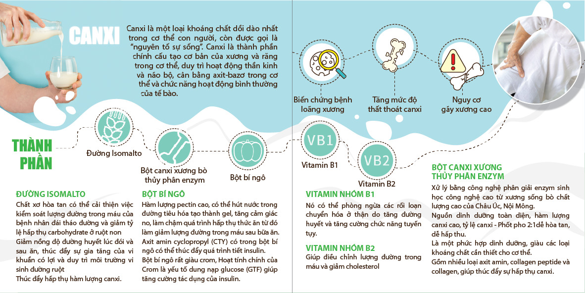 Quy cách: 100g (10g x 10 gói)/ hộp.Thành phần chính: Bột chiết xuất bí ngô 1.7g, bột xương (chiết xuất từ xương bò) 1.6g trong đó chứa 475mg canxi, bột cacao 0.2g, vitamin D 0.003mg. Phụ liệu: Sữa bộ...