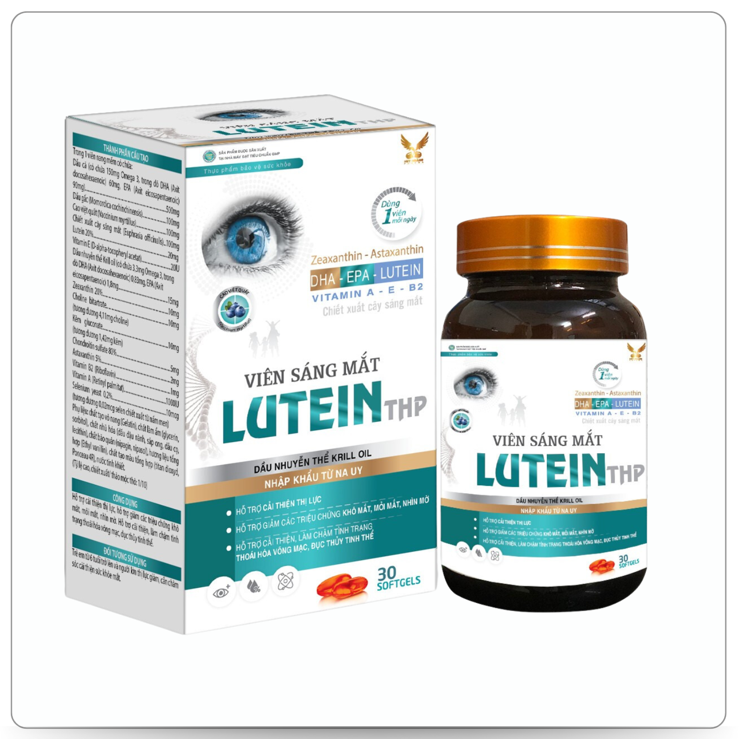 Lutein THP có chứa dầu cá, DHA, dầu gấc, lutein, chiết xuất cây sáng mắt,… hỗ trợ cải thiện thị lực; hỗ trợ giảm các triệu chứng: khô mắt, nhìn mờ, mỏi mắt.