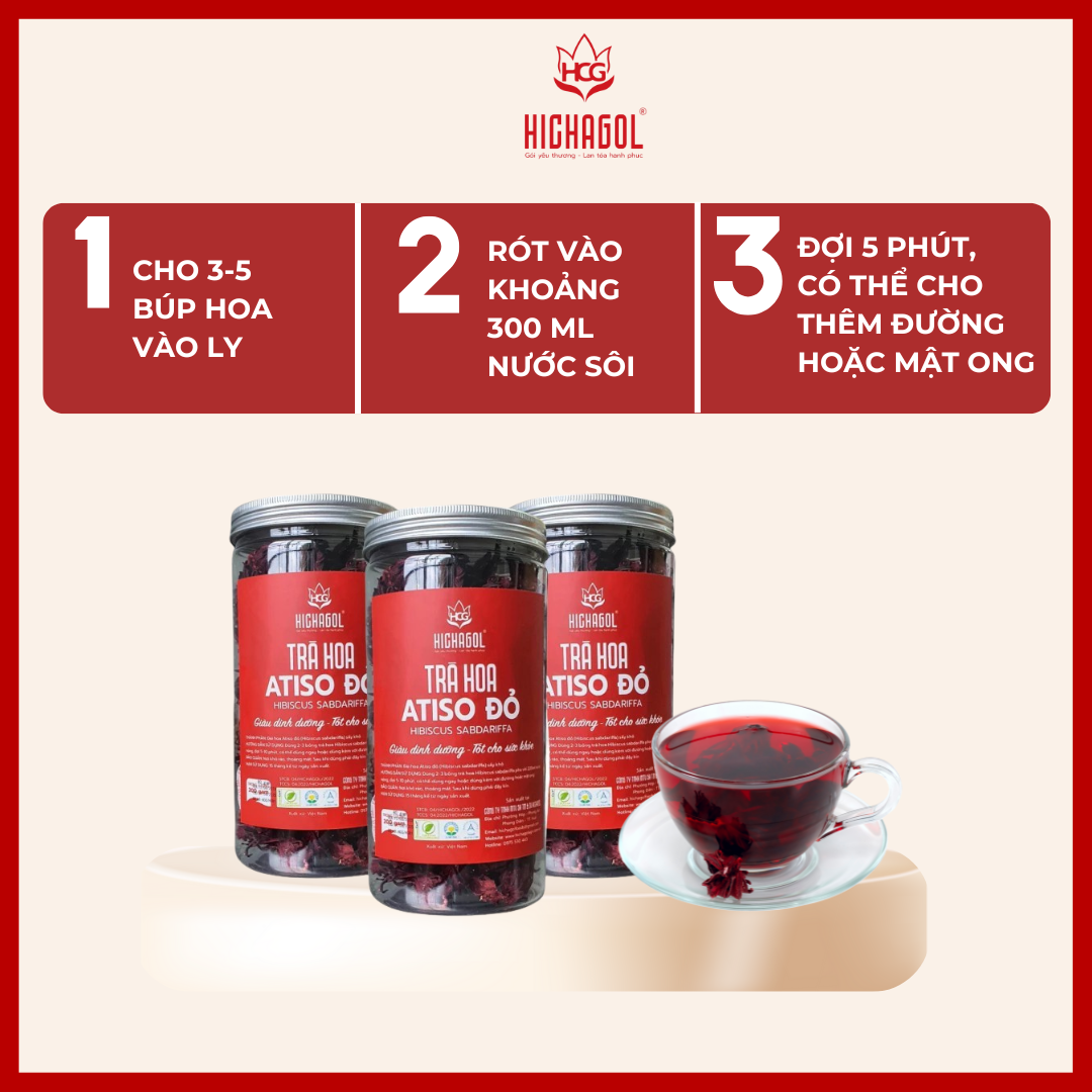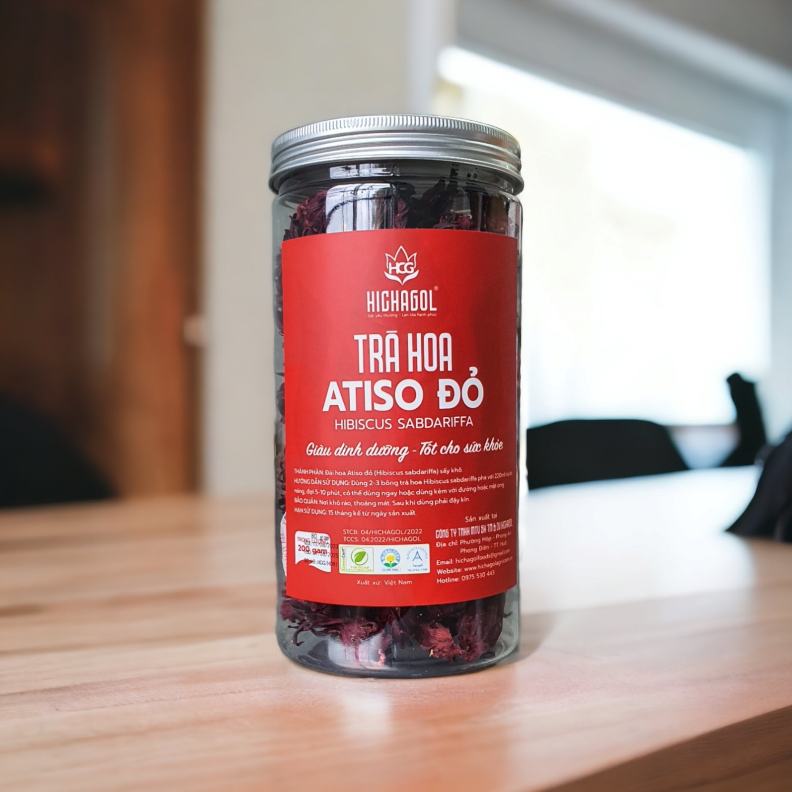 "HICHAGOL - Siro hoa atiso đỏ của chúng tôi được sản xuất khép kín, đảm bảo vệ sinh an toàn và chất lượng tốt nhất. Sử dụng thiết bị đóng gói hiện đại để bảo toàn nguyên vị, màu sắc và chất dinh dưỡng. CHI TIẾT SẢN PHẨM: Tên sản phẩm: Đài hoa nguyên nụ Atiso đỏ Xuất xứ: Việt Nam Sản xuất: Công ty TNHH MTV Sản Xuất Thương Mại và Dịch Vụ HICHAGOL Mùi vị: Vị chua ngọt tự nhiên, tính mát, hương thơm nhè nhẹ, dễ uống. Thành phần: đài hoa atiso đỏ (hibiscus sabdariffa) Cách đóng gói: Hũ nhựa 80gr Hạn sử dụng: 15 tháng Chứng nhận: VIETGAP, ISO 22000:2018 CÔNG DỤNG CỦA ATISO ĐỎ: Thanh lọc giải nhiệt tốt cho cơ thể. Thích hợp làm nước giải khát vào mùa hè. Giảm cân, phòng bệnh béo phì Tăng cường hệ miễn dịch, ngăn ngừa bệnh ho, viêm họng. Làm giảm sự hấp thu bia rượu vào máu. Tăng cường chức năng gan, bảo vệ gan Giúp hạ huyết áp, giảm cholesterol Tốt cho chức năng tiêu hóa. Lợi tiểu, lợi mật. Nhuận tràng, táo bón, phòng ngừa trĩ. HƯỚNG DẪN SỬ DỤNG: cho 3-5 hoa Hibiscus khô vào nước nóng 300 -500 ml ( tùy theo nhu cầu uống đạm nhạt của quý anh / chị) ngâm khoảng 10-20 phút rồi thưởng thức. Trà này có vị chua chua thanh thanh đặc trưng của atiso đỏ nên bạn cũng có thể sử dụng với những thực phẩm ngọt ngọt để tăng thêm sức hấp dẫn của trà nhé. Bảo quản nơi khô ráo, thoáng mát, tránh ánh nắng trực tiếp, đóng chặt nắp sau khi sử dụng. CAM KẾT SẢN PHẨM: Sản phẩm có nguồn gốc 100% từ thiên nhiên. Không chất bảo quản - Chất tạo màu - Hương liệu. Giao hàng trên toàn quốc. Được kiểm tra sản phẩm trước khi nhận. Miễn phí đổi trả nếu có lỗi từ sản phẩm. CHÍNH SÁCH ĐỔI TRẢ: Trường hợp được chấp nhận: Điều kiện áp dụng (trong vòng 03 ngày kể từ khi nhận sản phẩm) Hàng hoá vẫn còn mới, chưa qua sử dụng Hàng hóa hư hỏng do vận chuyển hoặc do nhà sản xuất. Không đủ số lượng, không đủ bộ như trong đơn hàng Trường hợp không đủ điều kiện áp dụng chính sách: Quá 03 ngày kể từ khi quý khách nhận hàng Gửi lại hàng không đúng mẫu mã, không phải hàng của cửa hàng. LƯU Ý: Không được dùng hoa atiso quá 3 tách trà 1 ngày sẽ gây tổn hại cho gan. Không uống trà Atiso đỏ khi đói. Hạn chế uống vào buổi tối. Phụ nữ mang thai hoặc cho con bú không nên uống hoa Atiso đỏ."