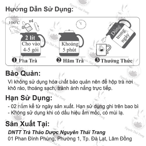 Sản Phẩm khi dùng sẽ có chút “ bột thuốc” trong nước. Do trà được sản xuất từ các loại thảo dược trong đó nhiều vị thuốc khi bào chế sẽ tạo thành bột mịn, loại bỏ sẽ làm giảm tác dụng của trà. Sau khi hãm, Bạn có thể để lắng hoặc lọc bỏ cặn sau đó dùng.