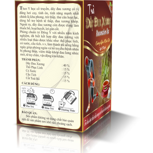 Phòng chuẩn tri Đông Y với nhiều năm kinh nghiệm, đã biết kết hợp dây đau xương với nhiều loại thảo dược khác như: thổ phục linh, cỏ xước, cẩu tí, làm thành trà uống hằng ngày giúp phòng ngừa và hỗ trợ cho bệnh nhân bị phong thấp, viêm thấp khớp đau lưng nhức mỏi, tê tay chân, vận động khó khăn.