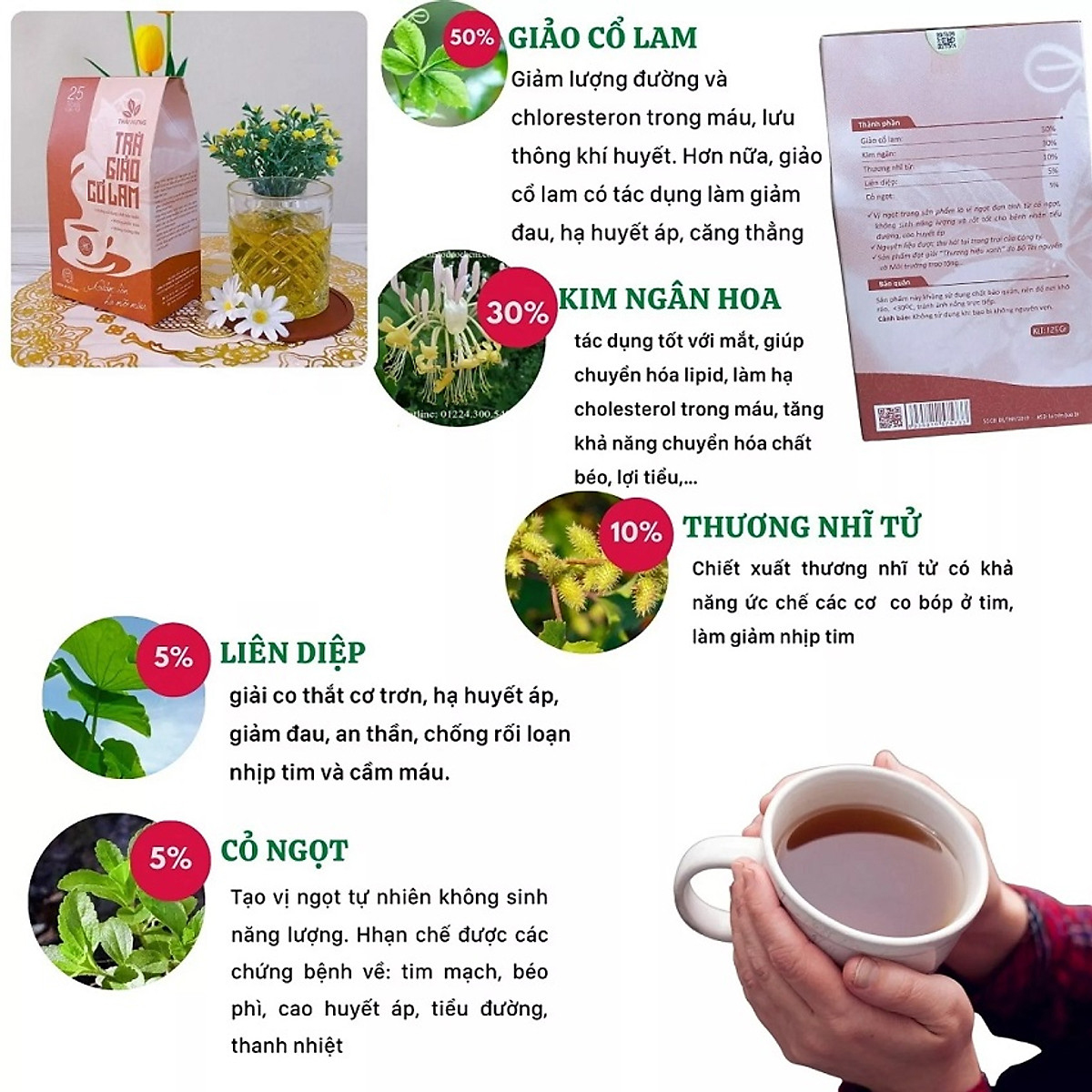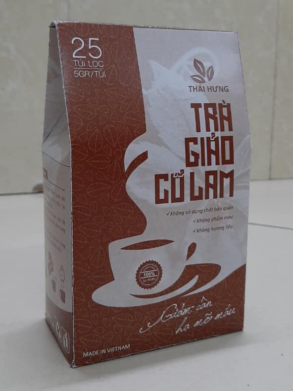 Mua tại TiktokTrà Giảo cổ lam Thái Hưng giảm cân, hạ mỡ máu 25 túi lọc x 5g Trà Thái Hưng có nguồn gốc thực vật. Sản phẩm là kết quả của Dự án nghiên cứu khoa học về trồng và bảo tồn dược liệu theo Quyết định số 3234/QĐ-BKHCN của Bộ Khoa học công nghệ. Giống và dược liệu đạt chuẩn GACP-WHO. Trà thảo mộc túi lọc - 100% tự nhiên - không chất bảo quản. Vị ngọt trong sản phẩm là vị ngọt đơn tính từ cỏ ngọt, không sinh năng lượng và không ảnh hưởng đến bệnh nhân tiểu đường hoặc cao huyết áp. Sản phẩm đạt giải xanh do Bộ Tài nguyên và môi trường trao tặng. Thành phần: