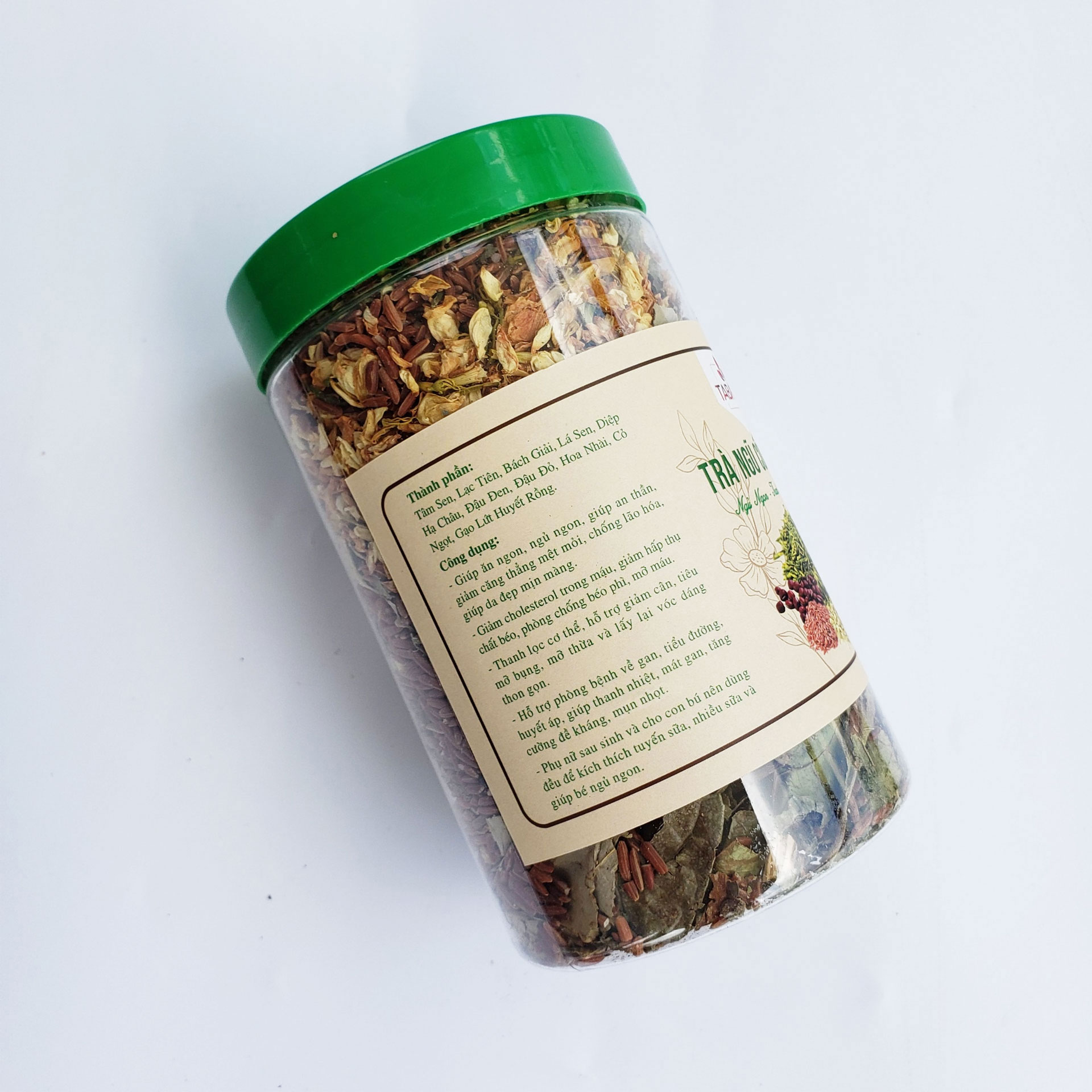 - 10 thành phần của trà ngũ cốc tâm sen Tabaha gồm: tâm sen, gạo lứt huyết rồng, xạ đen, đậu đỏ, đậu đen xanh lòng, hoa nhài, lá sen, lạc tiên, cỏ ngọt, bách giải. CÔNG DỤNG CỦA TRÀ GẠO LỨT TÂM SEN TABAHA