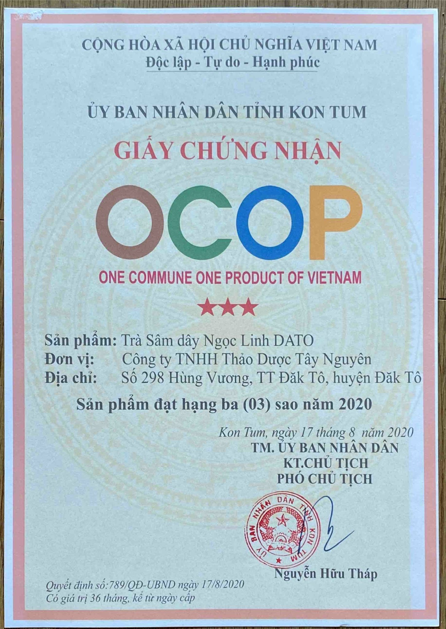 - Hỗ trợ phục hồi sức khỏe nhanh sau phẫu thuật Sâm dây Ngọc Linh là gì? Sâm dây Ngọc Linh đặc sản của Kon Tum. Sâm dây Ngọc Linh hay còn gọi là Đảng sâm mọc tự nhiên ở quanh chân núi Ngọc Linh, từ lâu đã được đồng bào Xê Đăng sử dụng để bồi bổ mỗi khi ốm đau, hay bổ sung năng lượng khi đi rừng. Khác với sâm dây ở các vùng khác, nhờ thổ nhưỡng tuyệt vời của núi Ngọc Linh, Sâm dây Ngọc Linh được xem là giống đảng sâm có dược tính tốt nhất ở Việt Nam. Trà sâm dây Ngọc Linh DATO món quà không thể thiếu khi đến Kon Tum. Sâm dây Ngọc Linh được Công Ty TNHH Thảo Dược Tây Nguyên trồng ở vùng núi Ngọc Linh theo tiêu chuẩn GACP-WHOVùng khí hậu này mát mẻ, thường xuyên được mây bao phủ ban đêm hoặc sáng sớm giúp cho sâm dây Ngọc Linh sinh trưởng cho chất lượng dược tính cao nhất. Vườn sâm dây Ngọc Linh, nguyên liệu chế biến Trà sâm dây Ngọc Linh DATO. Sâm dây Ngọc Linh được thu hoạch sau 2-3 năm trồng được sấy khô bằng máy sấy ở nhiệt độ 45 độ đến khô hoàn toàn để làm nguyên liệu sản xuất trà. Trà sâm dây Ngọc Linh được kết hợp 95% sâm dây Ngọc Linh và 5% tam thất, không sử dụng chất bảo quản, hương liệu và không trải qua quá trình nấu cao do đó bảo toàn được dược tính có trong sâm dây. Hướng dẫn sử dụng: cho gói trà vào 200ml nước sôi. Chờ 3-5 phút là dung được. Có thể sử dụng nóng hoặc lạnh hoặc kết hợp với đường phèn cam thảo xí muội. Sử dụng 2-3 lần mỗi ngày, duy trì trong thời gian 3 tháng để đạt hiệu quả