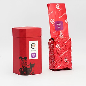 Hộp bát giác có kích thước 13 x 7,5 x 7,5cm, chất liệu giấy mĩ thuật màu đỏ - đen. Hoa văn in trên hộp là hoa văn dân gian tranh Đông Hồ "Mục đồng thổi sáo". Bên trong có 01 gói trà trọng lượng 100gr, được hút chân không trong bao tráng bạc. Trà Sen Bảo Lộc