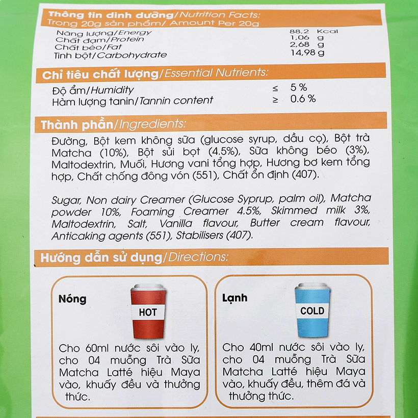 Trà sữa hòa tan Maya với hương vị tự nhiên: Matcha Latté sẽ tạo nên những hương vị độc đáo giúp bạn sảng khoái trong cuộc sống hàng ngà Hãy tận hưởng cuộc sống năng động Với “Trà sữa hòa tan Matcha Latté tỏa hương trà thơm ngát ngay sau khi pha. Sản phẩm được làm từ những lá trà tươi thiên nhiên qua quá trình chế biến kỹ lưỡng, cho bạn tách trà sữa thơm ngon, dễ chịu và thư giãn.