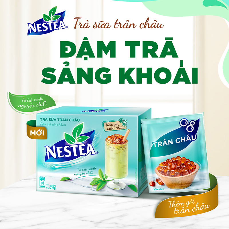 - Vị ngọt & béo nhẹ, phù hợp với thị hiếu thưởng thức trà sữa hiện đại. THÀNH PHẦN TRÀ SỮA NESTEA: Đường, bột kem (có chứa sữa - contain mik), sữa bột tách kem (6,5%) - skimmed milk powder, bột whey (cô chứa sữa - contain milk), chiết xuất trà xanh (3,5%), hương liệu giống tự nhiên, bột trà xanh (0,5%), muối i-ốt, chất tạo ngọt tổng hợp (acesulfam kali, sucralose). Sản phẩm có thể chứa gluten và đậu nành (may contain gluten and soya). Lưu ý: Không dùng cho người dị ứng với các thành phần của sản phẩm. TRÂN CHÂU: Nước, đường, chất ổn định (425, 407, 401, 1422, 508), chất điều chỉnh độ acid (327, 330), hương liệu tự nhiên và giống tự nhiên, đường caramel, chất bảo quản 202, chất tạo ngọt tổng hợp 950, đường đen. Lưu ý: Nhai kỹ trước khi nuốt. Trẻ em dưới 11 tuổi nên ăn dưới sự giám sát của người lớn. HƯỚNG DẪN SỬ DỤNG Cho 1 gói trà sữa Nestea vào 70 ml nước nóng, khuấy đều, thêm đá, cho gói trân châu và thưởng thức. HƯỚNG DẪN BẢO QUẢN Bảo quản sản phẩm nơi khô ráo và thoáng mát, tránh ánh nắng trực tiếp. LƯU Ý