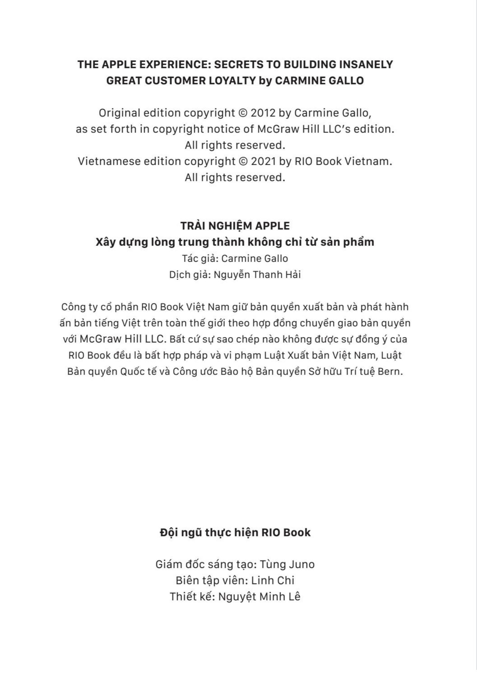 “Trải nghiệm Apple: Xây dựng lòng trung thành không chỉ từ sản phẩm” sẽ đi sâu vào phân tích trải nghiệm khách hàng xuất sắc của Apple, đặc biệt là trải nghiệm bán lẻ ấn tượng tại các cửa hàng Apple. Cuốn sách sẽ đưa ra những lời khuyên hữu ích dành cho các thương hiệu muốn nâng cấp dịch vụ khách hàng vượt trội, trở nên nổi bật trên thị trường và muốn xây dựng được tập khách hàng trung thành tuyệt đối.