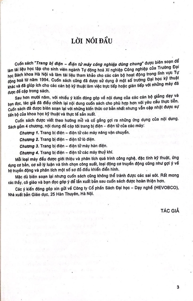 Cuốn sách "Trang bị điện – điện tử máy công nghiệp dùng chung" được biên soạn. làm tài liệu học tập cho sinh viên ngành Tự động hoá Xí nghiệp Công nghiệp của Trường Đại học Bách khoa Hà Nội và làm tài liệu tham khảo cho các cán bộ hoạt động trong lĩnh vực Tự động hoá từ năm 1994. Cuốn sách cũng đã được sử dụng ở một số trường Đại học kỹ thuật khác và đã giúp ích cho các cán bộ kỹ thuật làm việc trực tiếp hoặc gián tiếp với những máy đã được đề cập trong sách. Sau hơn mười năm, với nhiều ý kiến đóng góp về nội dung của các cán bộ giảng dạy và bạn đọc, tác giả đã điều chỉnh lại nội dung cuốn sách cho phù hợp hơn với yêu cầu thực tiễn. Cuốn sách đã được biên soạn lại với những kiến thức cơ bản nhất nhưng vẫn cập nhật được sự tiến bộ của khoa học kỹ thuật và thực tế sản xuất. Cuốn sách được viết theo hướng mở và cố gắng gợi ra những ứng dụng của nội dung. Sách gồm 4 chương, nội dung đề cập tới trang bị điện – điện tử của các máy: Chương 1. Trang bị điện – điện tử các máy nâng vận chuyển. Chương 2. Trang bị điện – điện tử lò điện. Chương 3. Trang bị điện - điện tử máy hàn điện. Chương 4. Trang bị điện - điện tử các máy thuỷ khí. Mỗi loại máy đều được giới thiệu và phân tích quá trình công nghệ, đặc tính kỹ thuật, ứng dụng cơ bản, cơ sở lý luận và tính chọn công suất, loại động cơ truyền động cũng như gợi ý về hệ truyền động và phân tích một số sơ đồ điều khiển điển hình.