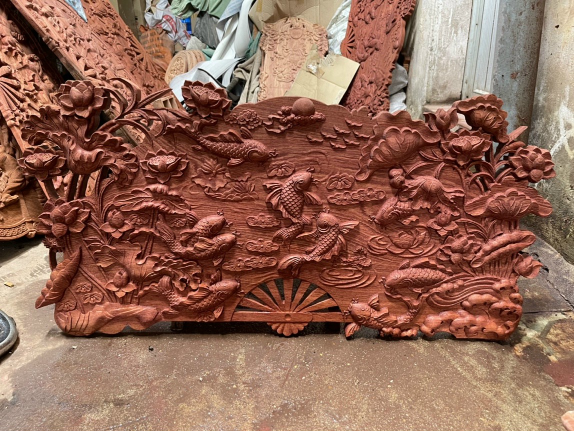 Cận cảnh trạm khắc bức Cửu ngư quần hội tại Tranh gỗ Minh Châu