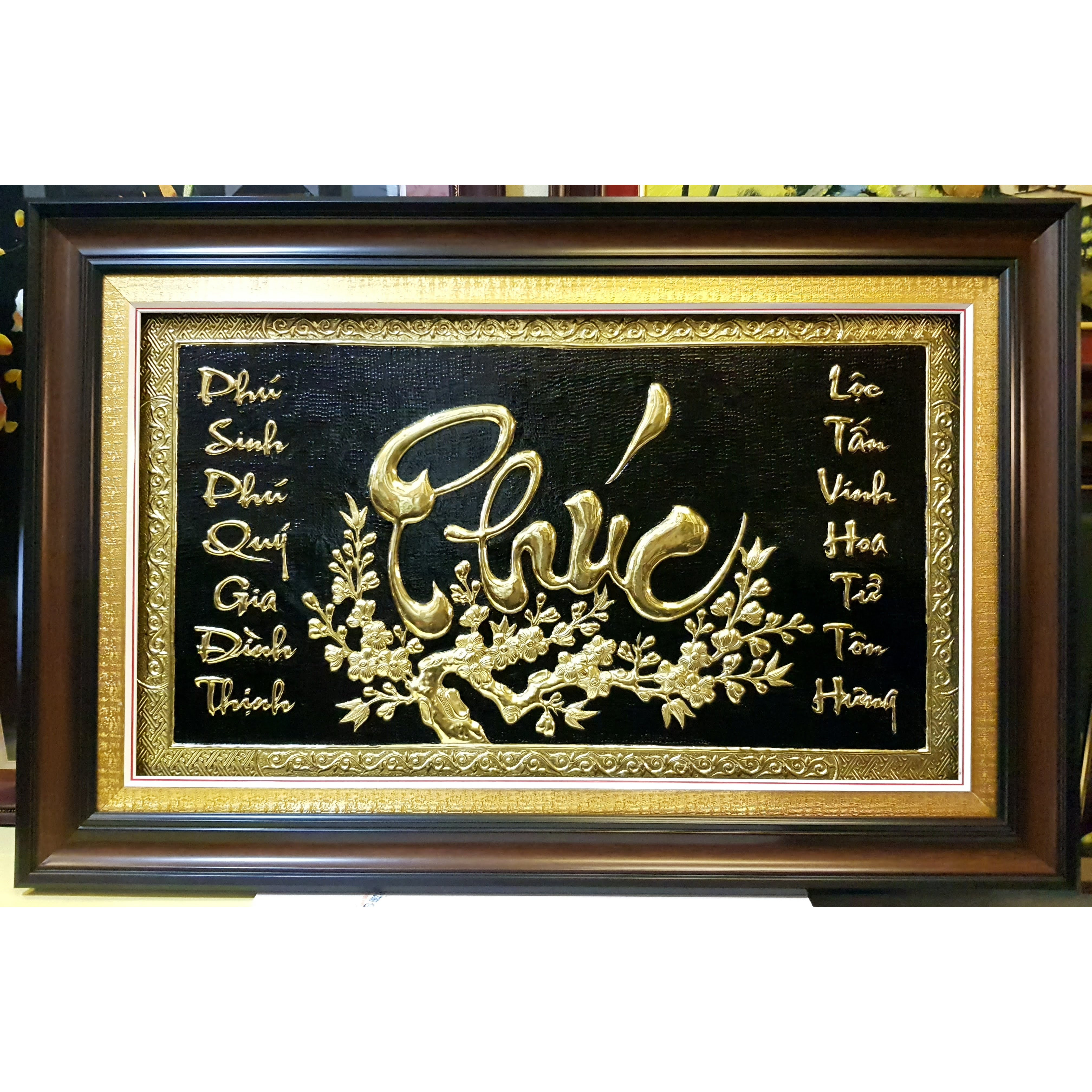 Mua tại TiktokTranh đồng thư pháp chữ PHÚC Chất liệu: Đồng vàng nguyên chất 100% liền tấm, tranh được thúc gò, chạm khảm hoàn toàn thủ công rất sắc nét tinh xảo. Khung tranh màu nâu vân gỗ composite chống mối mọt, bền đẹp, mặt tranh lồng kính hoặc mika. Kích thước phủ khung 70*110cm PHÚC SINH PHÚ QUÝ GIA ĐÌNH THỊNH LỘC TẤN VINH HOA TỬ TÔN HƯNG