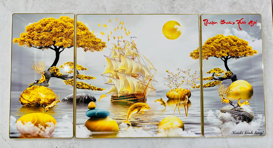 TRANH TREO TƯỜNG TRANG TRÍ QUÁN Chất liệu : I- Tranh Kim sa Tranh được in PP sau đó ép 1 lớp lụa kim sa tạo đô lấp lánh cho bức tranh và được ép