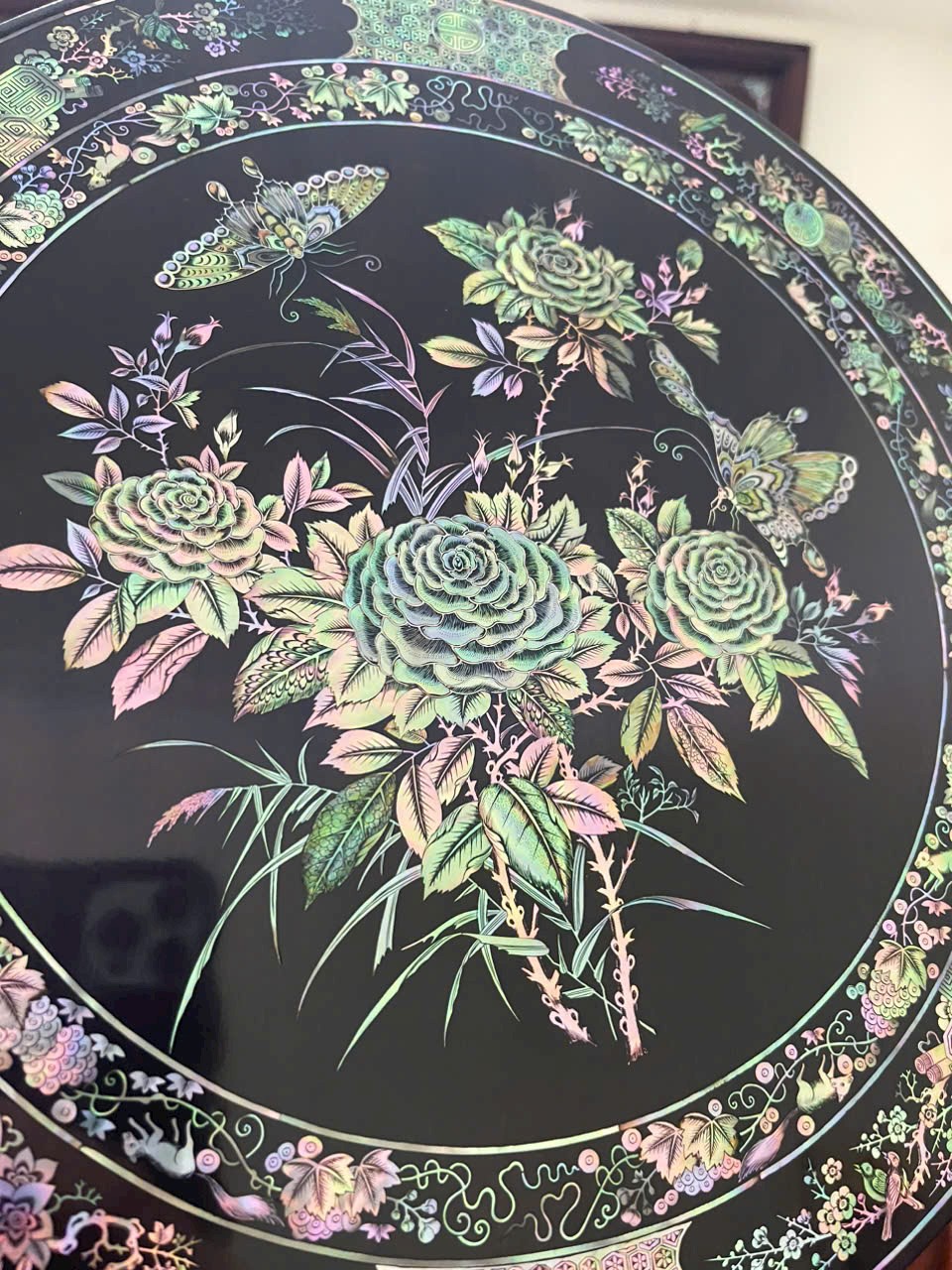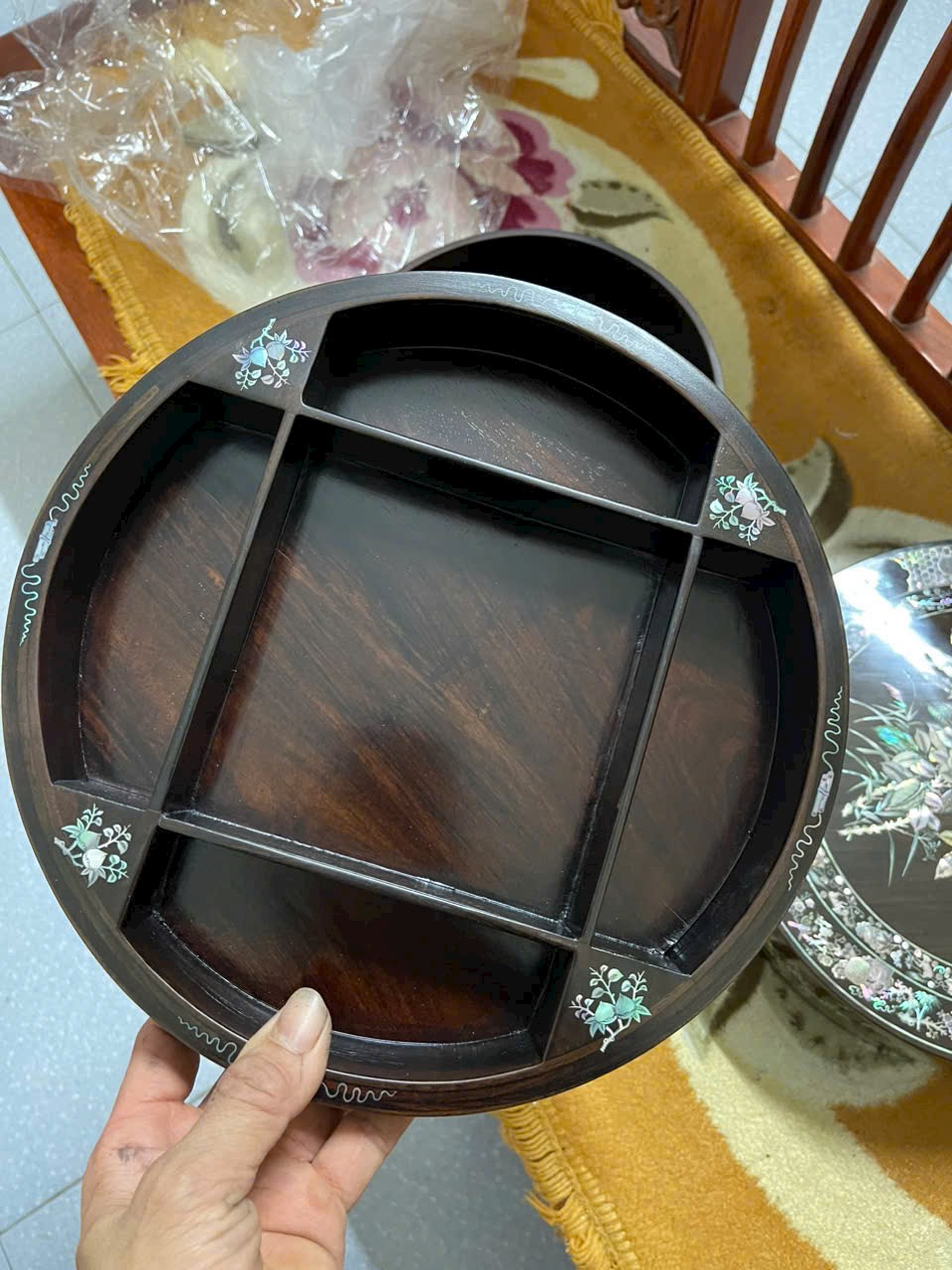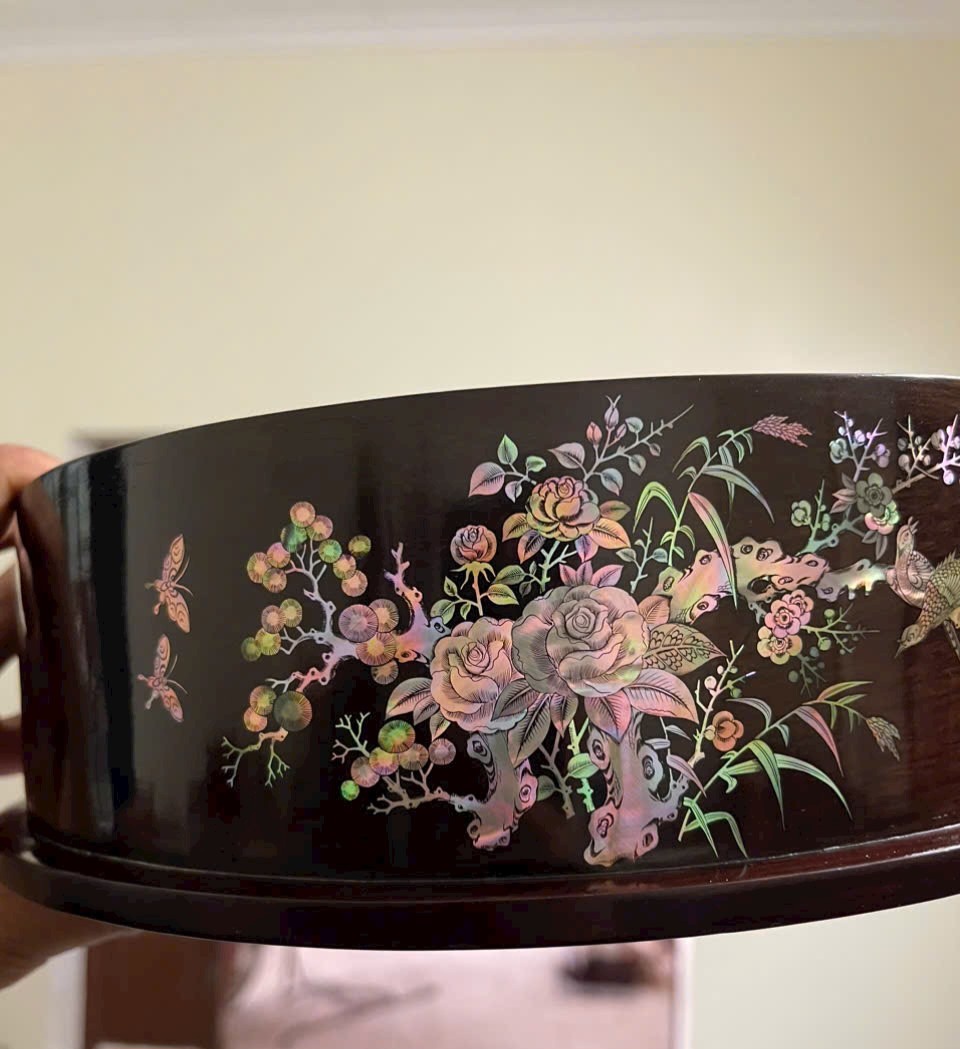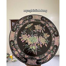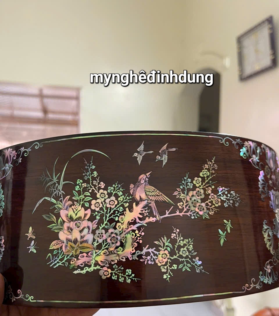 ✨Tráp tròn gỗ trắc khảm ốc đỏ kt mặt tròn 30 cao 11.6cm