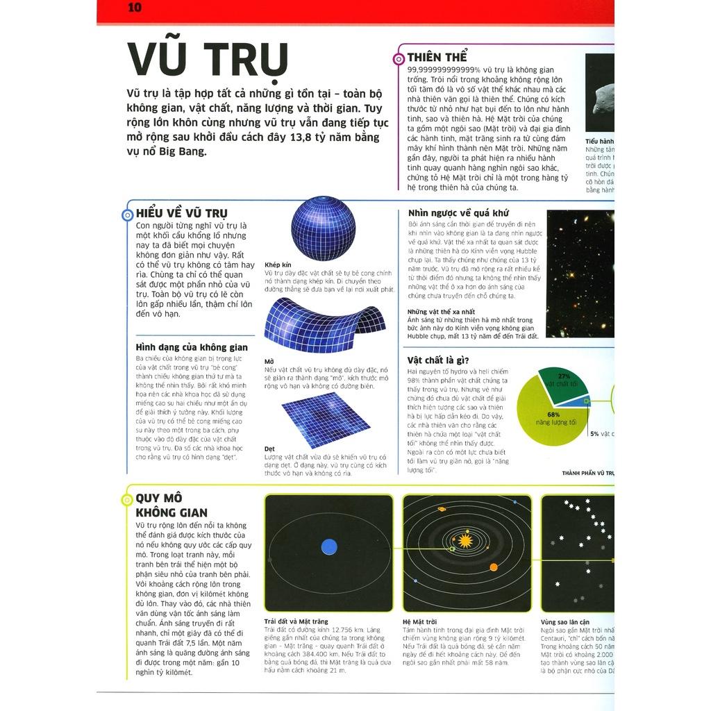 Mua tại TiktokTri Thức Về Vạn Vật - Một Thế Giới Trực Quan Chưa Từng Thấy Cuốn sách gồm 6 chương sẽ mang đến cho bạn đọc những trải nghiệm thú vị bao gồm: KHÔNG GIAN – KHÁM PHÁ KHÔNG GIAN VŨ TRỤ BAO LA Du hành và khám phá bí ẩn của vũ trụ từ vụ nổ BigBang tới sự hình thành của các thiên hà, từ sự ra đời đến cái chết của một ngôi sao như thế nào, cùng tìm hiểu hệ mặt trời và các hoạt động nghiên cứu thiên văn khác. Cuốn sách mang đến kiến thức nền tảng và trải nghiệm chân thực như một nhà du hành qua những hình ảnh đồ họa sắc nét, chú thích rõ ràng cụ thể. TRÁI ĐẤT – KHÁM PHÁ NHỮNG TRI THỨC VỀ TRÁI ĐẤT TỪ TẬN LÕI SÂU Cùng bạn rong ruổi cùng trời cuối đất, khám phá hành tinh xanh từ cấu trúc lõi trái đất gồm những tầng nào đến các mảng kiến tạo trên bề mặt địa c.ầu, hiểu về các hiện tượng tự nhiên như Bão, núi lửa phun trào, động đất đến giải đáp các bí ẩn đại dương… TỰ NHIÊN – TRẢI NGHIỆM NHƯ NHỮNG NHÀ TỰ NHIÊN HỌC Giải đáp câu hỏi quá trình tiến hóa của các giống loài từ 3,8 tỷ năm trước cho đến hiện tại. Tìm hiểu sự sống khắp hành tinh, từ những đỉnh núi cao nhất đến vực thẳm sâu nhất dưới lòng đại dương. CƠ THỂ NGƯỜI – TRẢI NGHIỆM NHƯ NHÀ GIẢI PHẪU HỌC Cơ thể người là một cỗ máy phức tạp kỳ diệu, được hình thành từ hàng triệu phần khác nhau. Cuốn sách sẽ giúp bạn tìm hiểu từ cấu trúc của một tế bào nhỏ bé đến cơ thể người bình thường, qua đó hiểu được cách thức hoạt động, cấu tạo cơ thể. KHOA HỌC – TRẢI NGHIỆM NHƯ NHÀ KHOA HỌC Cuốn sách giải thích những quy luật ngầm – nguyên lý hoạt động chi phối sự vận hành của vạn vật, từ nguyên tử và ánh sáng cho tới lực hấp dẫn và từ trường. Nhờ đó khơi nguồn cảm hứng của chúng ta để tạo ra nhiều loại máy móc và công nghệ ngày càng hiện đại hơn. LỊCH SỬ - KHÁM PHÁ NHƯ NHÀ SỬ HỌC Cuốn sách tái hiện những câu chuyện lịch sử của nhân loại, từ cuộc chiến tranh cổ đại đến những tai họa kinh khủng dẫn tới dân tộc diệt vong. Cuốn sách cũng nghiên cứu các thành tựu tiến bộ của loài người về văn hóa – công nghệ từ thời đồ đá đến hiện nay.