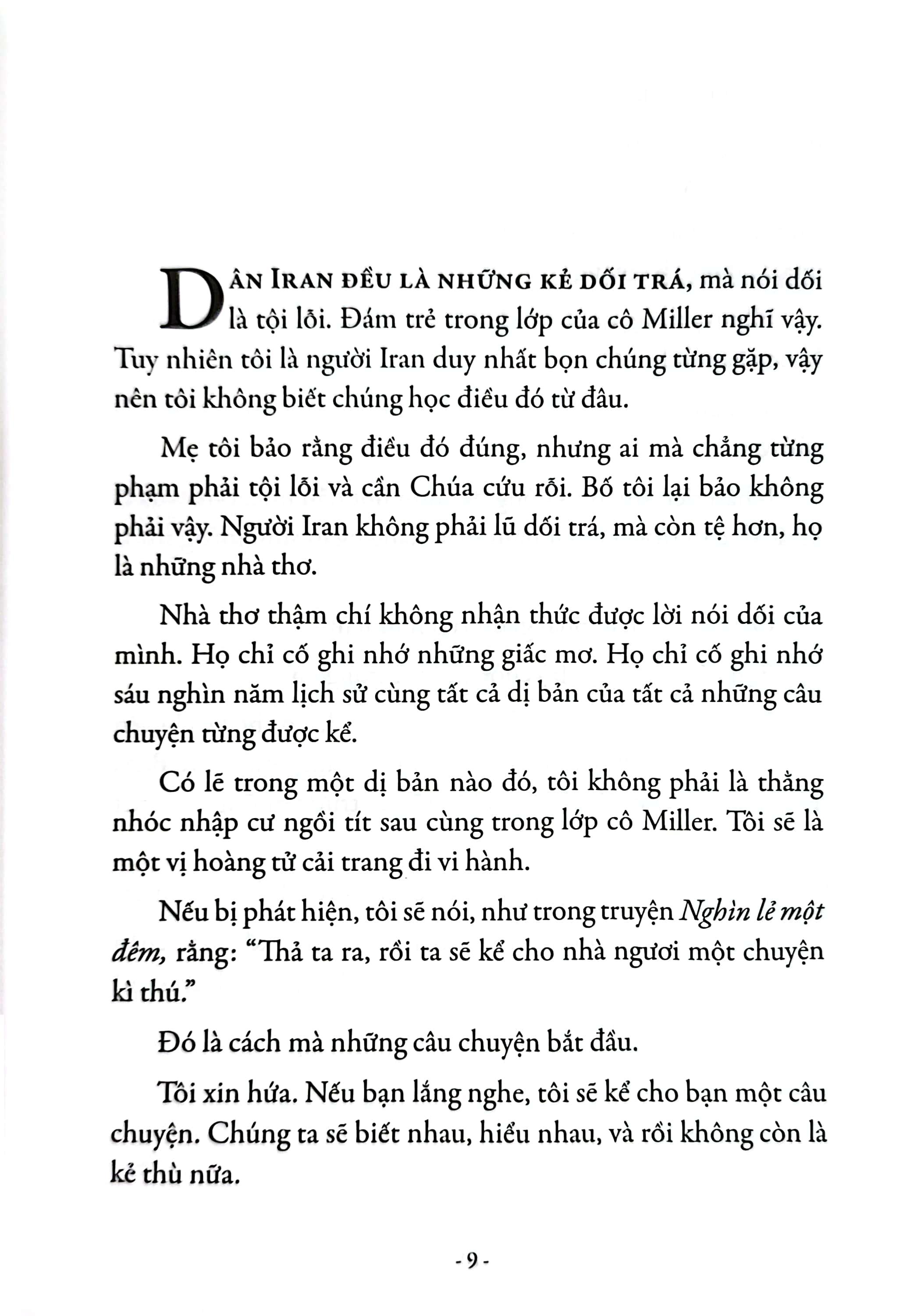 Cậu nhóc nhập cư Daniel kể chuyện đời mình và hành trình đến Mĩ theo cách nàng Scheherazade trong Nghìn lẻ một đêm mê hoặc vua Shahryar bằng truyền thuyết về Thủy thủ Sinbad, Aladdin và cây đèn thần… Những câu chuyện của cậu vừa đẹp đẽ vừa bi thương, kể từ thời điểm mẹ và chị đưa cậu bỏ trốn khỏi Iran lúc nửa đêm, ngược dòng nhiều năm, nhiều thập kỉ, thậm chí nhiều thế kỉ, về căn nhà cũ thơm hương hoa nhài tại thành phố Isfahan xinh đẹp, về cung điện của các vị vua, về vùng đất của truyện thần tiên…