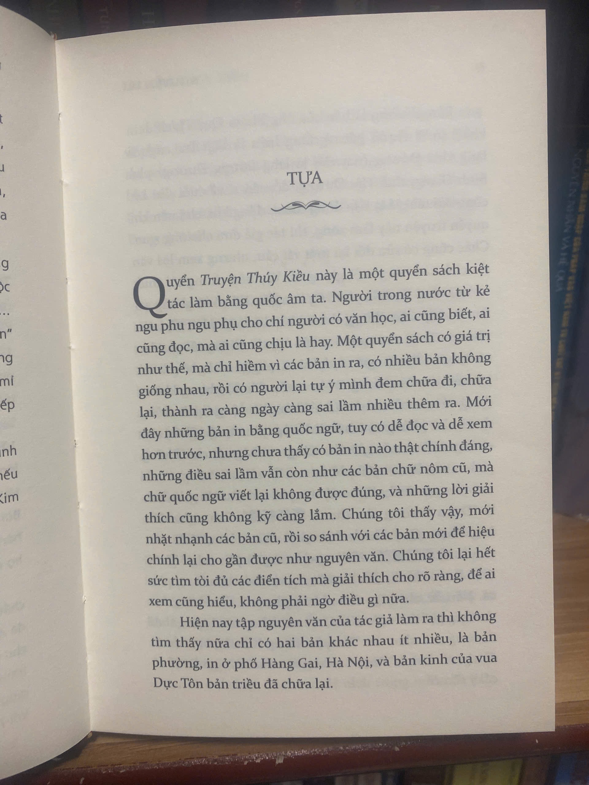 Trong phần “Tựa” của ấn bản, các học giả cũng có giải thích vì sao đặt tên là Truyện Thúy Kiều: “Truyện Thúy Kiều này nguyên lúc đầu tác giả nhan là Đoạn trường tân thanh. Sau nghe đâu ông Phạm Quý Thích đổi lại là Kim, Vân, Kiều tân truyện. Nhưng vì trong truyện chỉ có Thúy Kiều là vai chính, còn Kim Trọng và Thúy Vân là vai phụ cả. Nếu đề như vậy, thì e không hợp lẽ. Vả chăng tục thường gọi là truyện Kiều, thì chi bằng ta cứ theo thói thường mà nhan là Truyện Thúy Kiều, rồi ở dưới đề thêm tên cũ Đoạn trường tân thanh, gọi là để tỏ cái ý tồn cổ.”